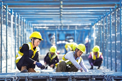10月2日,建设者在包银高铁跨昆都仑河特大桥预制梁场作业。国庆假期,承担包(头)银(川)高铁跨昆都仑河特大桥项目建设任务的中铁上海工程局1800多名工人坚守岗位,抢抓工期,稳步推进工程进度。包银高铁设计时速250公里,是我国“八纵八横”高速铁路网京兰通道的重要组成部分,计划2025年建成通车。王文武 摄