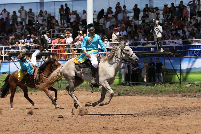 文艺演出结束后,还进行了传统的那达慕赛事项目。赛马场上群马奔腾,场面蔚为壮观,骑手们精湛的骑术赢得观众阵阵欢呼。摔跤场上,搏克手你来我往,互不相让,斗智斗勇。射箭场上,男女射手一比高低。