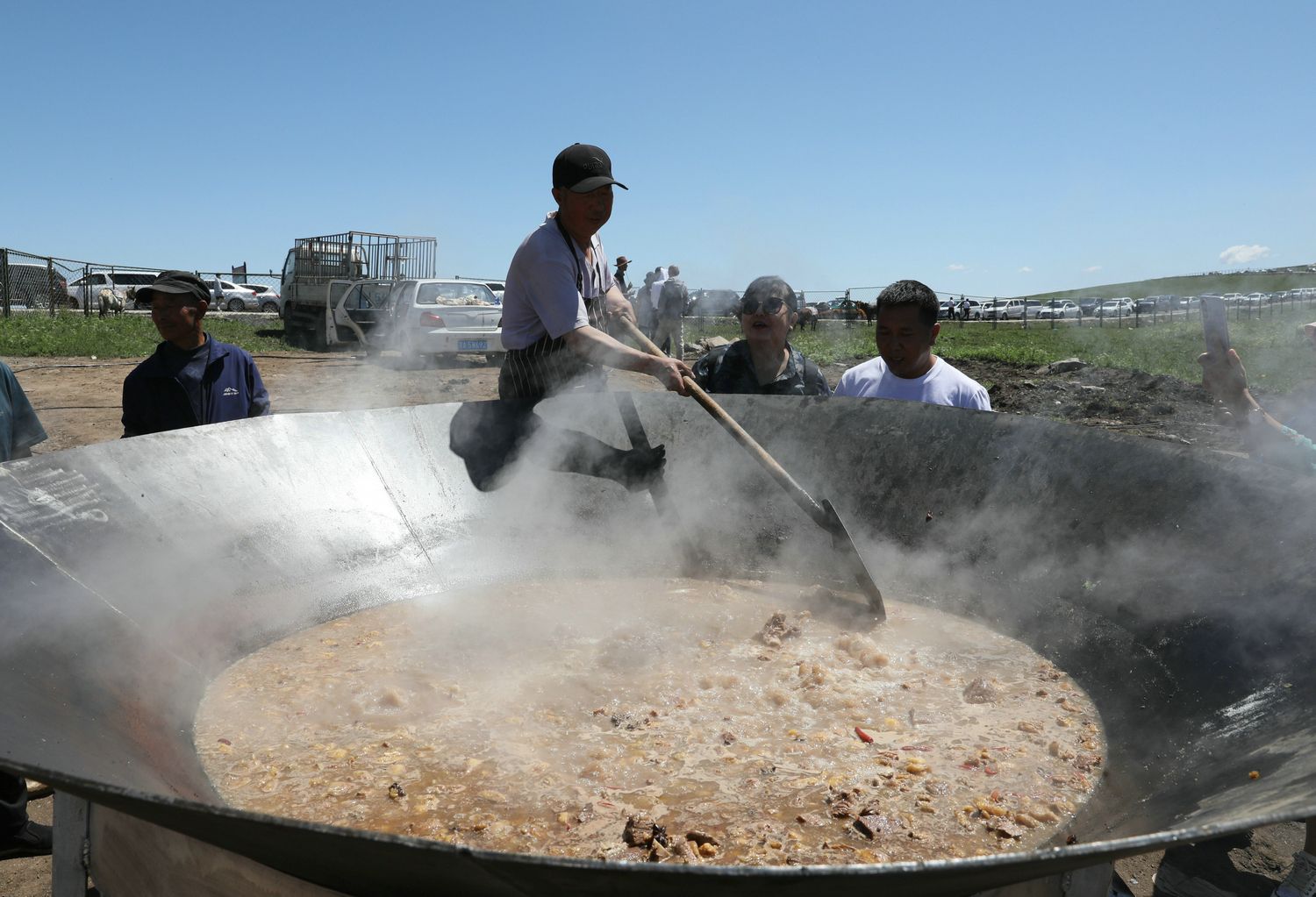 直径3.6米大锅炖了两头牦牛肉,供游客免费品尝