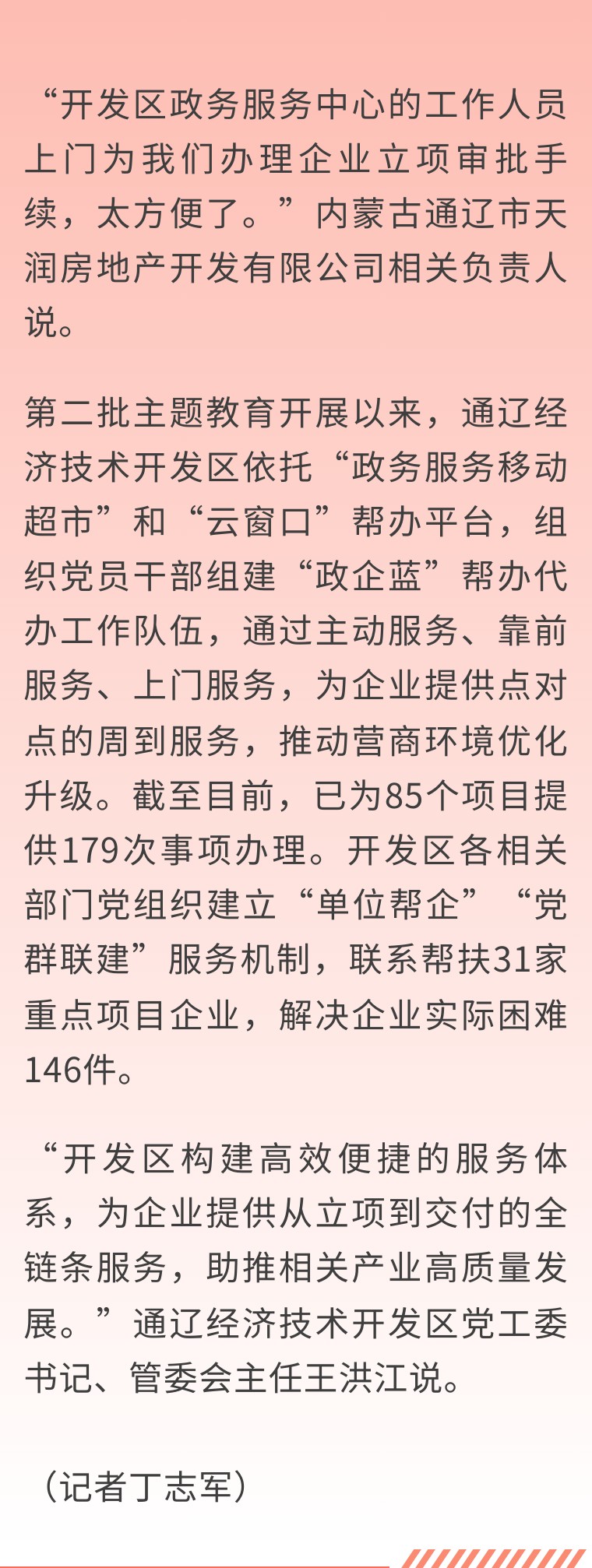 2024年1月10日,《人民日报》第6版刊发题为《内蒙古通辽推动营商环境优化升级上门服务企业助推产业发展》的文章,报道了内蒙古通辽经济技术开发区依托“政务服务移动超市”和“云窗口”帮办平台,组织党员干部组建“政企蓝”帮办代办工作队伍,为企业提供点对点的周到服务,推动营商环境优化升级。