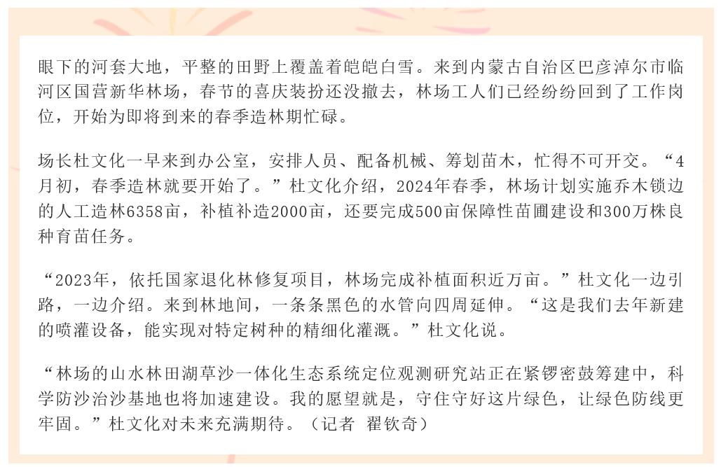 2024年2月22日,《人民日报》第7版刊发题为《内蒙古巴彦淖尔市临河区国营新华林场场长杜文化——“守住守好这片绿色”》的文章,报道了在内蒙古自治区巴彦淖尔市临河区国营新华林场,春节的喜庆装扮还没撤去,林场工人们已经纷纷回到了工作岗位,开始为即将到来的春季造林期忙碌。