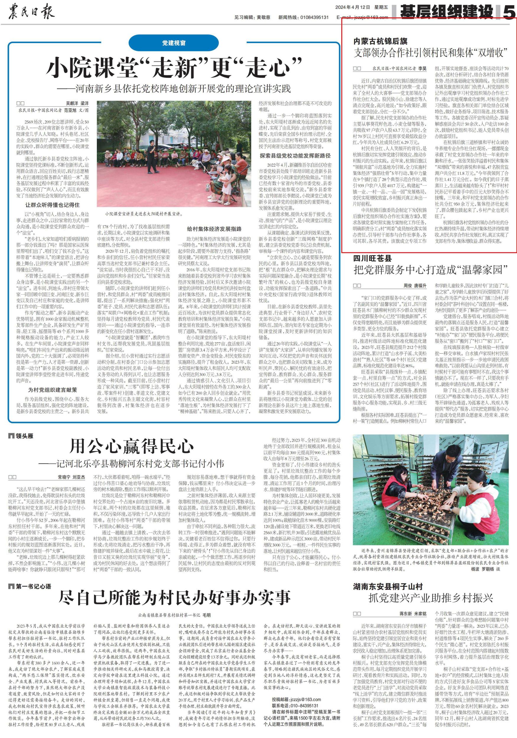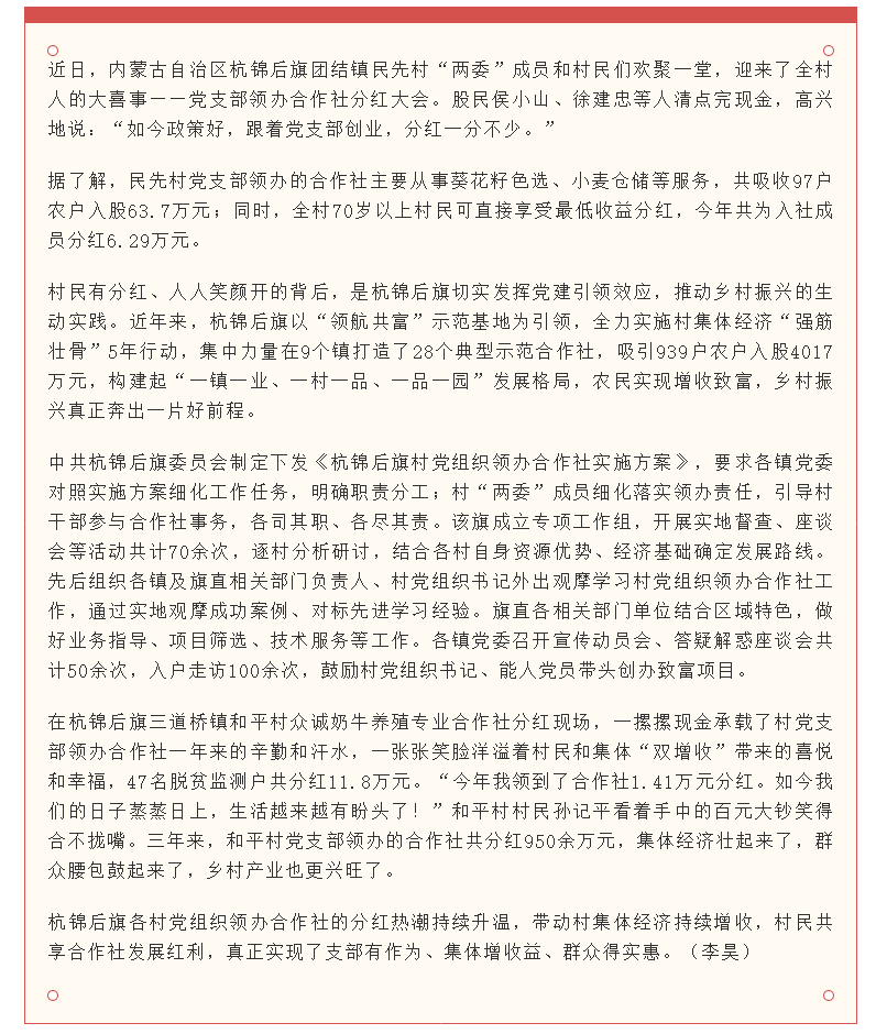 2024年4月12日,《农民日报》第5版刊发题为《内蒙古杭锦后旗支部领办合作社引领村民和集体“双增收”》的文章,报道了杭锦后旗各村党组织领办合作社的分红热潮持续升温,带动村集体经济持续增收,村民共享合作社发展红利,真正实现了支部有作为、集体增收益、群众得实惠。