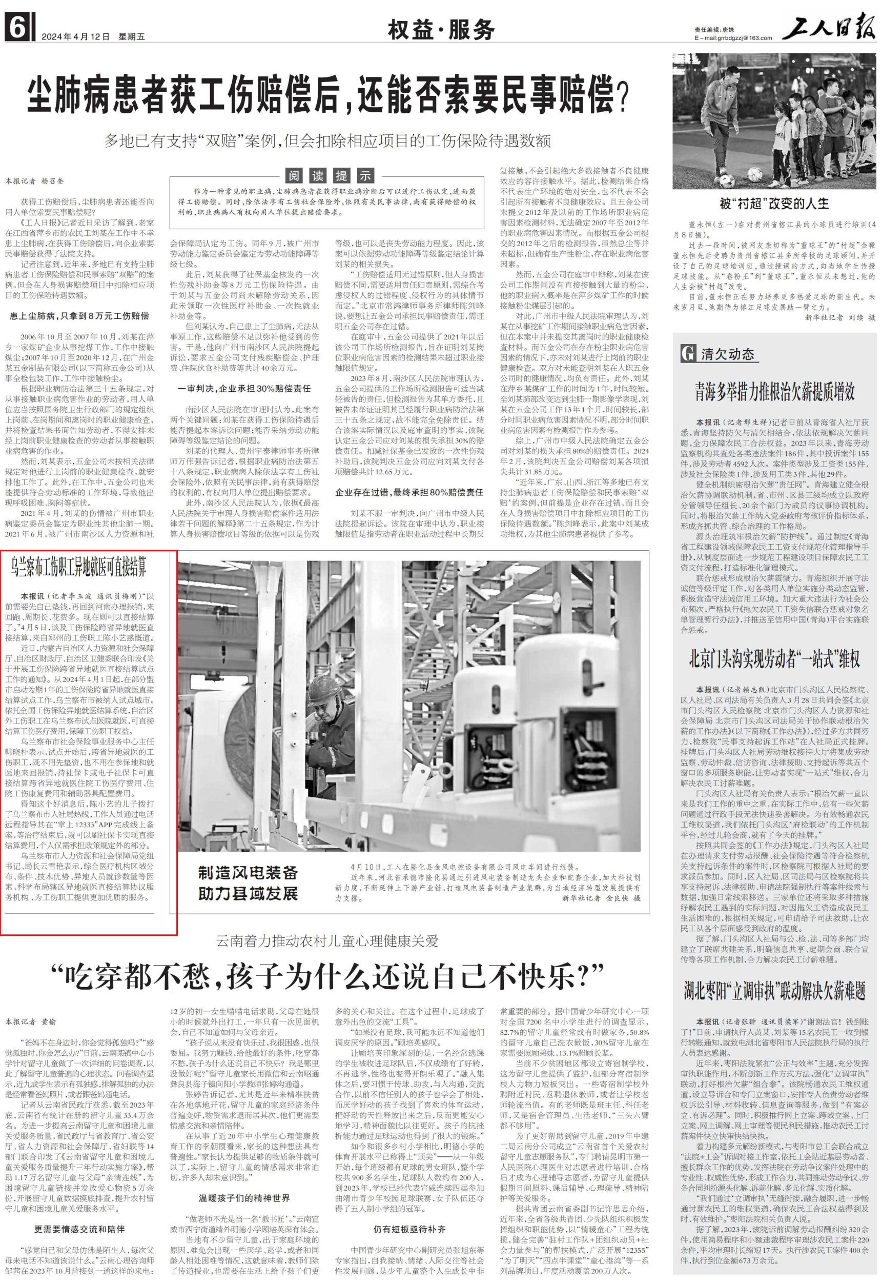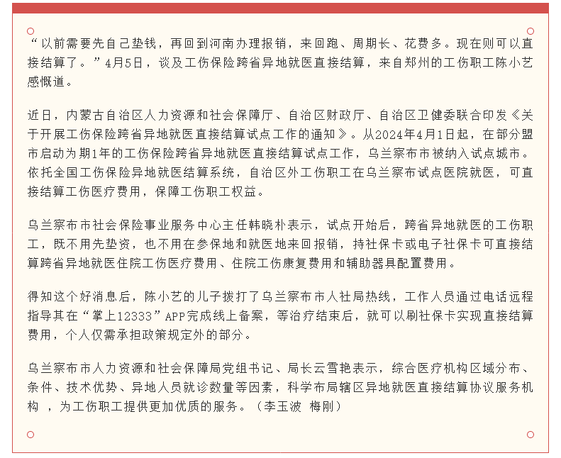 2024年4月12日,《工人日报》第6版刊发题为《乌兰察布工伤职工异地就医可直接结算》的文章,报道了乌兰察布市依托全国工伤保险异地就医结算系统,自治区外工伤职工在乌兰察布试点医院就医,可直接结算工伤医疗费用,保障工伤职工权益。