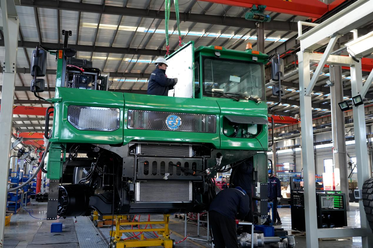 内蒙古铁辰智能装备有限公司大吨位纯电动无人驾驶宽体矿用车批量下线。
