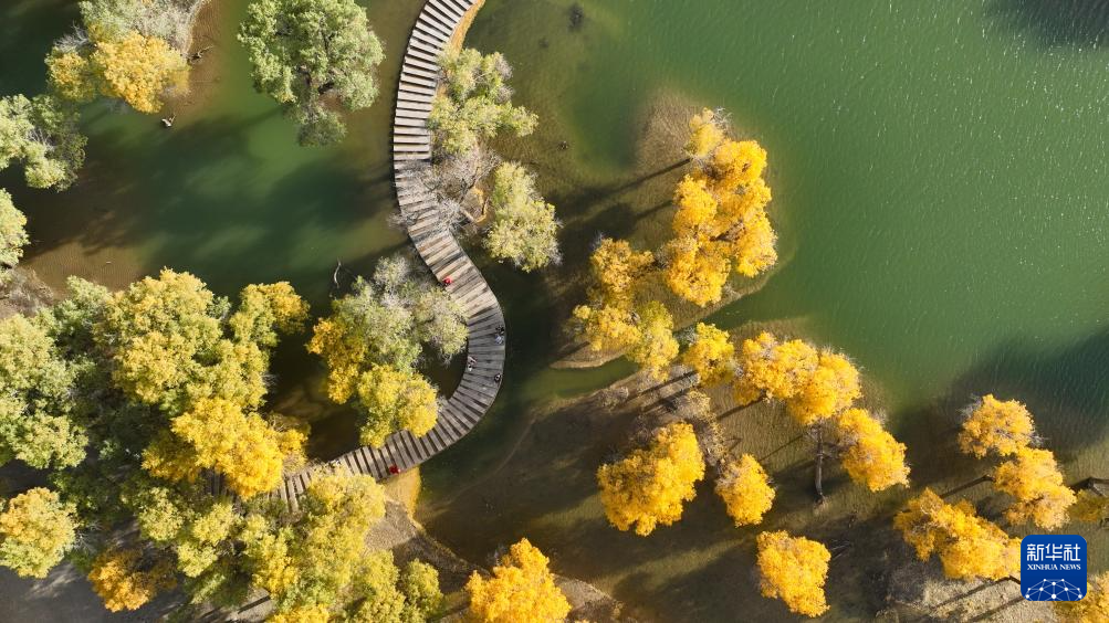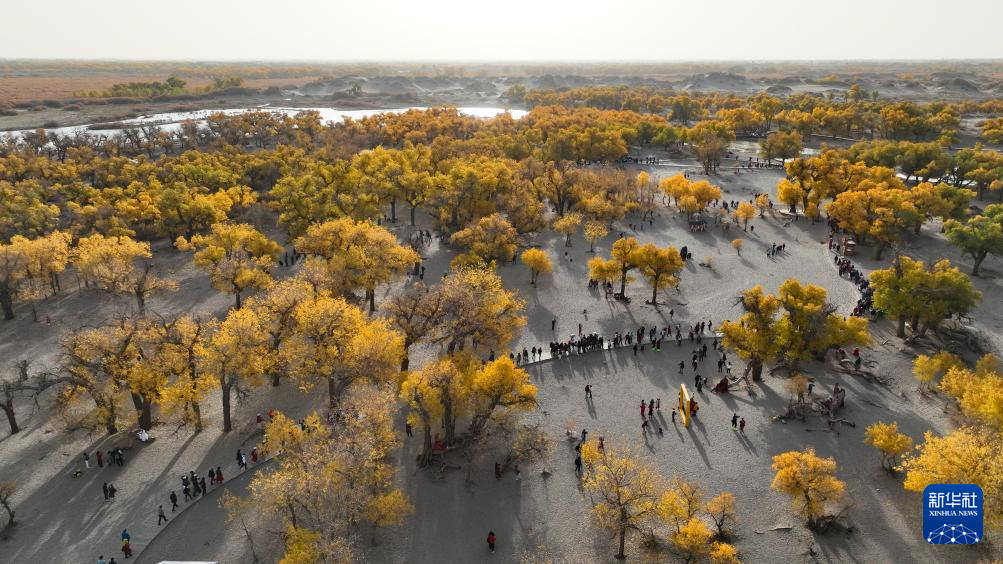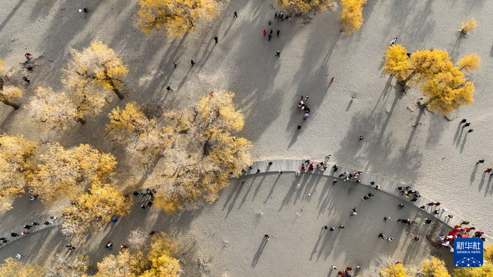 10月13日,游客在内蒙古阿拉善盟额济纳旗额济纳胡杨林旅游区游玩(无人机照片)。新华社记者 贝赫 摄