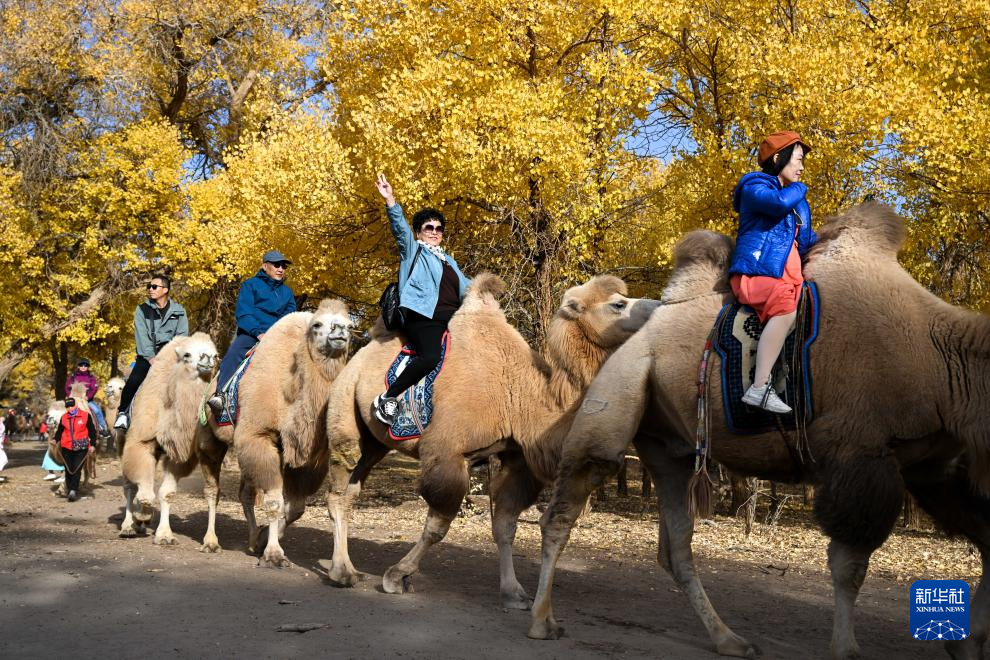 10月13日,游客在内蒙古阿拉善盟额济纳旗额济纳胡杨林旅游区骑骆驼。新华社记者 贝赫 摄