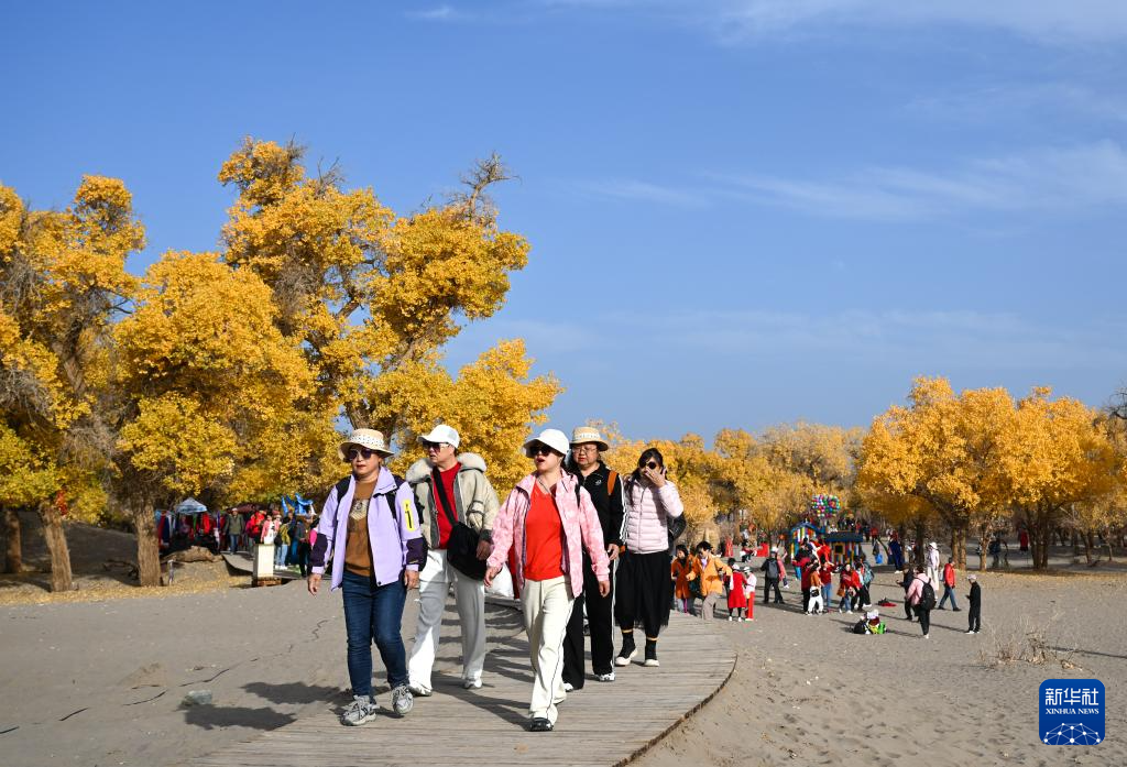 10月13日,游客在内蒙古阿拉善盟额济纳旗额济纳胡杨林旅游区游玩。新华社记者 刘莲芬 摄