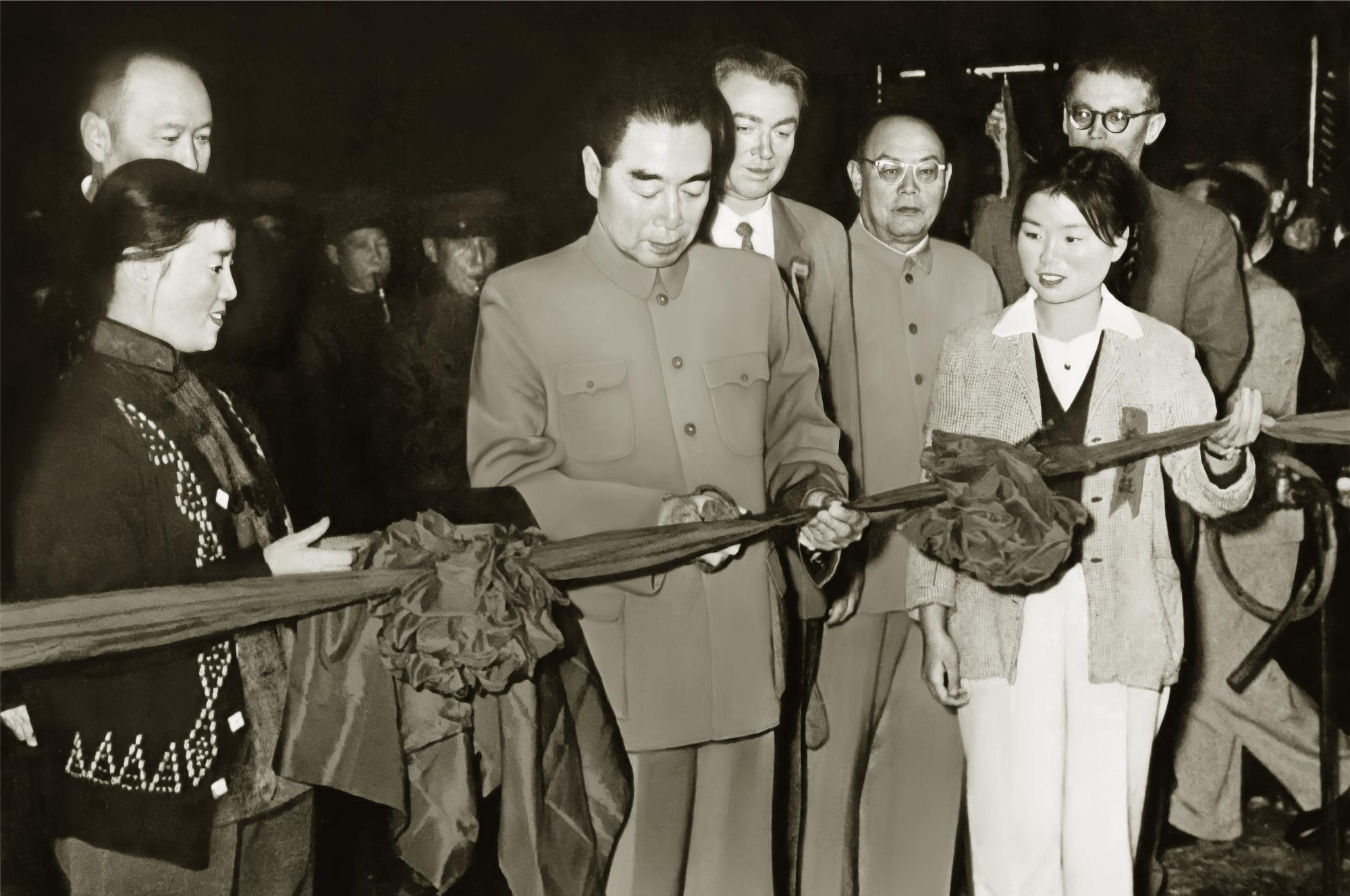 周恩来总理为一号高炉出铁剪彩。