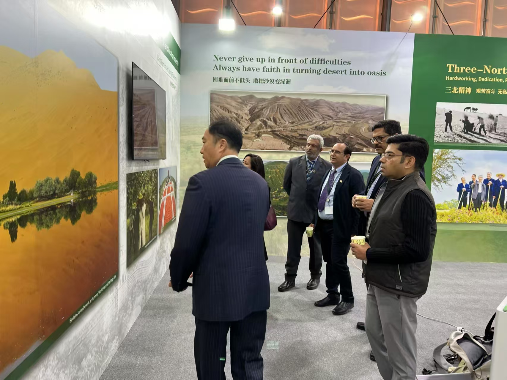 在《联合国防治荒漠化公约》第十六次缔约方大会中国馆展出的巴丹吉林沙漠图片吸引了各国嘉宾驻足.(图片由阿拉善盟委宣传部提供)