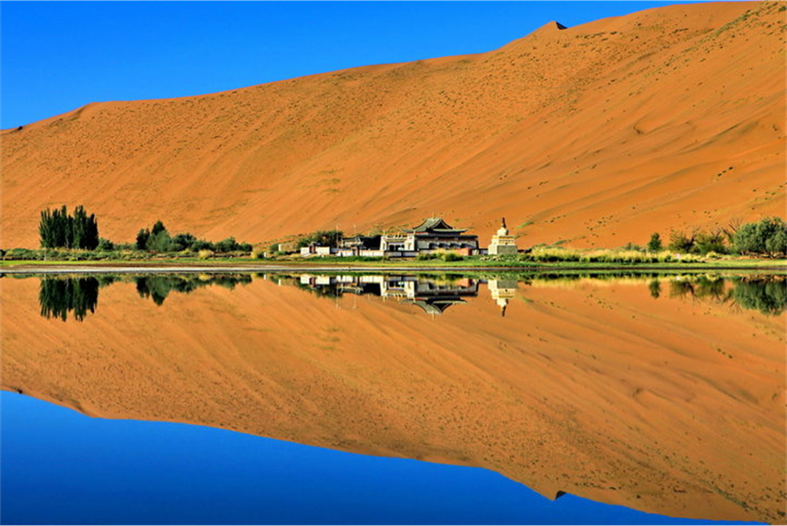 湖光沙色,古庙倒影。