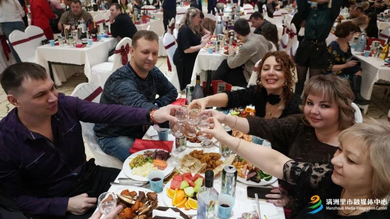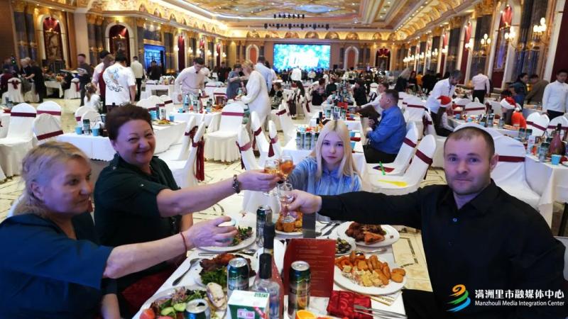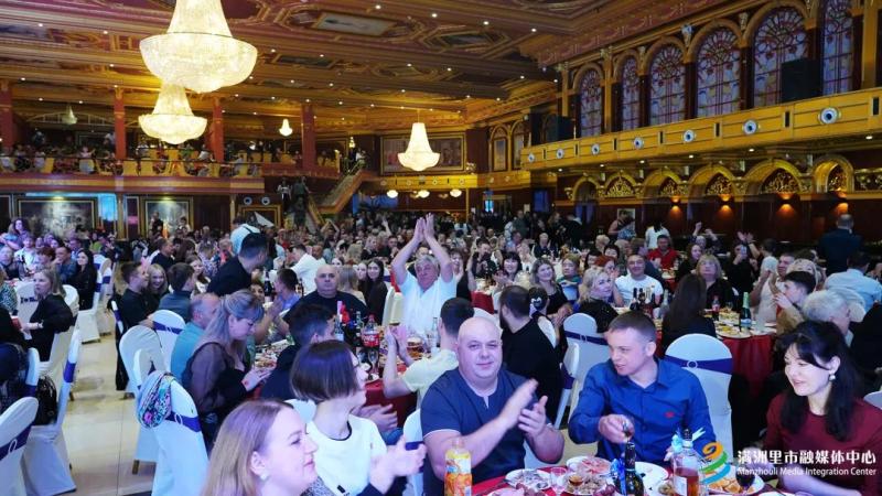 在口岸国际大酒店的舞台上,节目异彩纷呈,中式传统鼓乐激昂豪迈,舞狮表演灵动矫健、活灵活现,瞬间点燃现场气氛;俄罗斯歌唱家引吭高歌,展现了浓郁的斯拉夫风情。台下,众多俄罗斯人围坐享用自助餐,边欣赏节目边畅聊,其乐融融。
