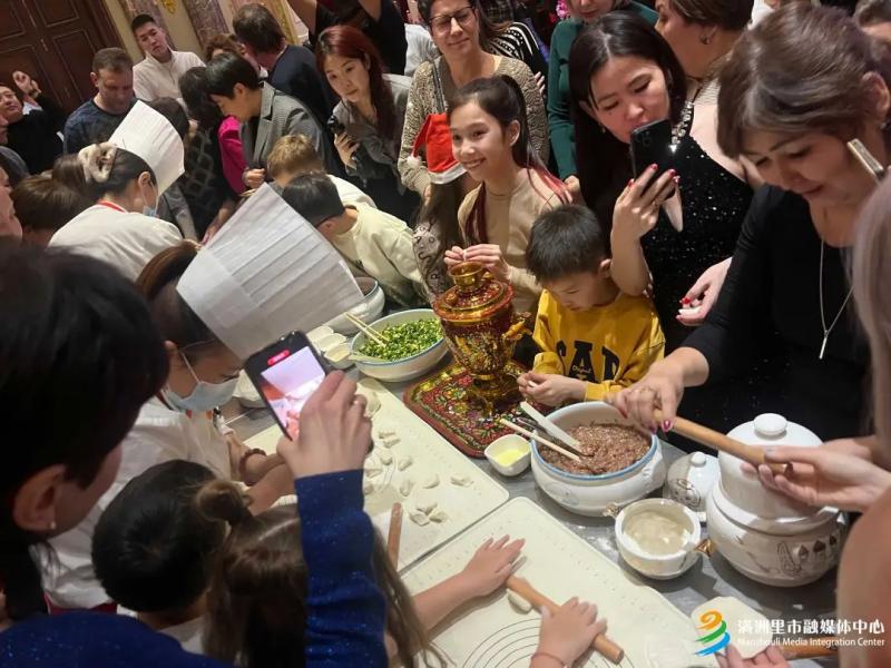 当晚,套娃酒店还精心设置了包饺子体验环节,专业厨师身着整洁的厨师服,手法娴熟地示范包饺子。家长们带着孩子兴致勃勃地体验包饺子这一中国传统习俗。孩子们争先恐后、跃跃欲试,在手里摆弄着饺子皮和馅料,看着一个个形态各异的饺子在手中诞生,眼中满是新奇与兴奋。俄罗斯家长安娜是一家四口来中国跨年的,她满脸笑意地感慨道:“在中国过新年,包饺子这个习俗太奇妙了!它就像一个文化的纽带,让我们这些异国他乡的人能真正融入到这里的节日氛围中。每一个饺子都包裹着中国人对新年的美好期盼,现在我们也能亲手制作,感觉和这座城市、和这里的人们更近了。”孩子们也跟着有样学样,小手忙个不停。大女儿达莎兴奋地说:“满洲里是一座漂亮的城市!”小女儿莉娜也奶声奶气地附和:“我爱中国,我很喜欢吃中国的饺子。”