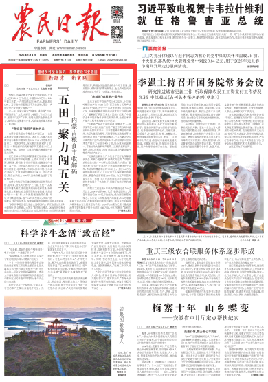 2025年1月5日,《农民日报》头版刊发题为《“五田”聚力闯五关——内蒙古粮食丰收解码》的文章,报道了2024年,内蒙古粮食产量首次突破800亿斤大关,达到820.1亿斤,比上年增加28.5亿斤。这一年,内蒙古锚定“闯新路、进中游”目标,不断创新生产方式,高标田、吨粮田、节水田、生态田、托管田“五田”并举,破题发展农业新质生产力,提升农业全要素生产率,为农业高质量发展注入了新动能。