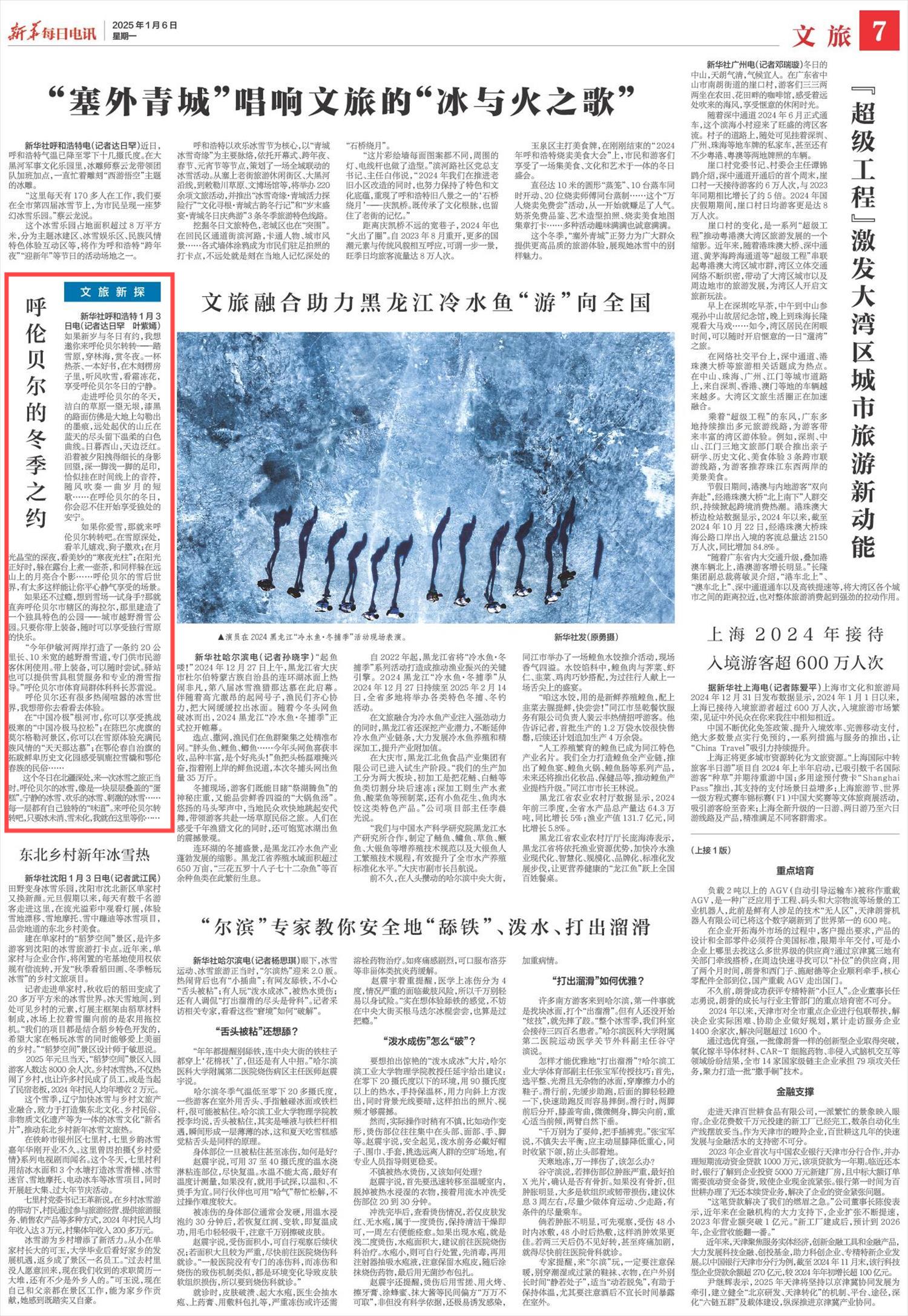 2025年1月6日,《新华每日电讯》第7版刊发题为《呼伦贝尔的冬季之约》的文章,报道了冬日的呼伦贝尔可以踏雪原,穿林海,赏冬夜。听风吹雪,看霜冻花,尽情享受冬日的浪漫与宁静。
