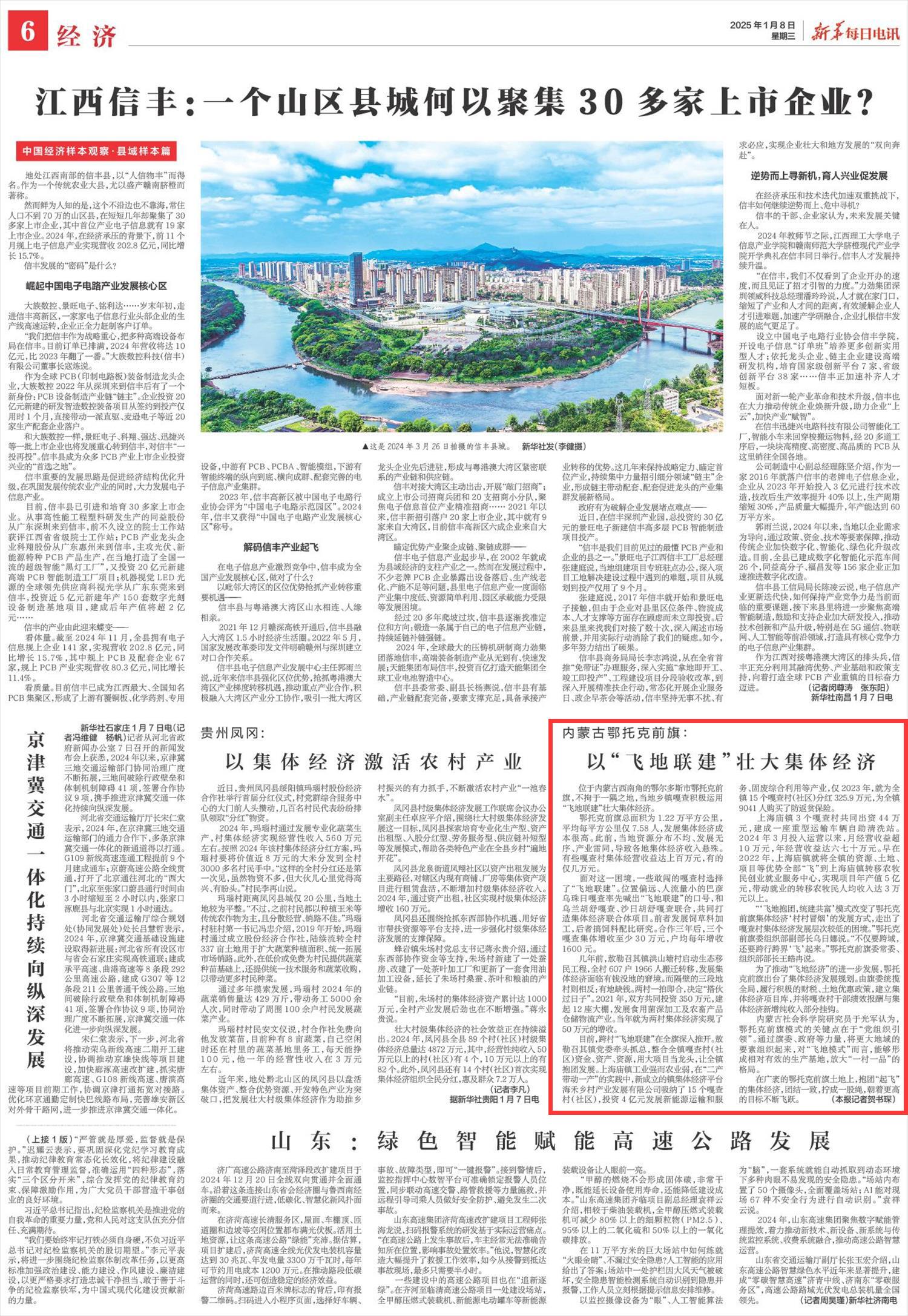 2025年1月8日,《新华每日电讯》第6版刊发题为《内蒙古鄂托克前旗:以“飞地联建”壮大集体经济》的文章,报道了内蒙古鄂尔多斯市鄂托克前旗,不拘于一隅之地,当地乡镇嘎查积极运用“飞地联建”壮大集体经济,团结一致,拧成一股绳,朝着更高的目标不断飞跃。