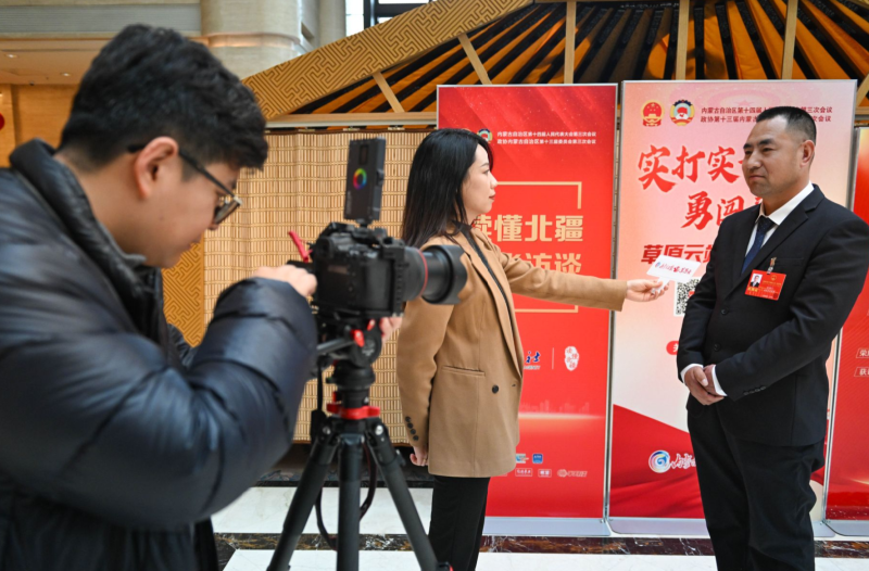 1月12日,参加自治区十四届人大三次会议的人大代表接受内蒙古日报·草原云记者采访。