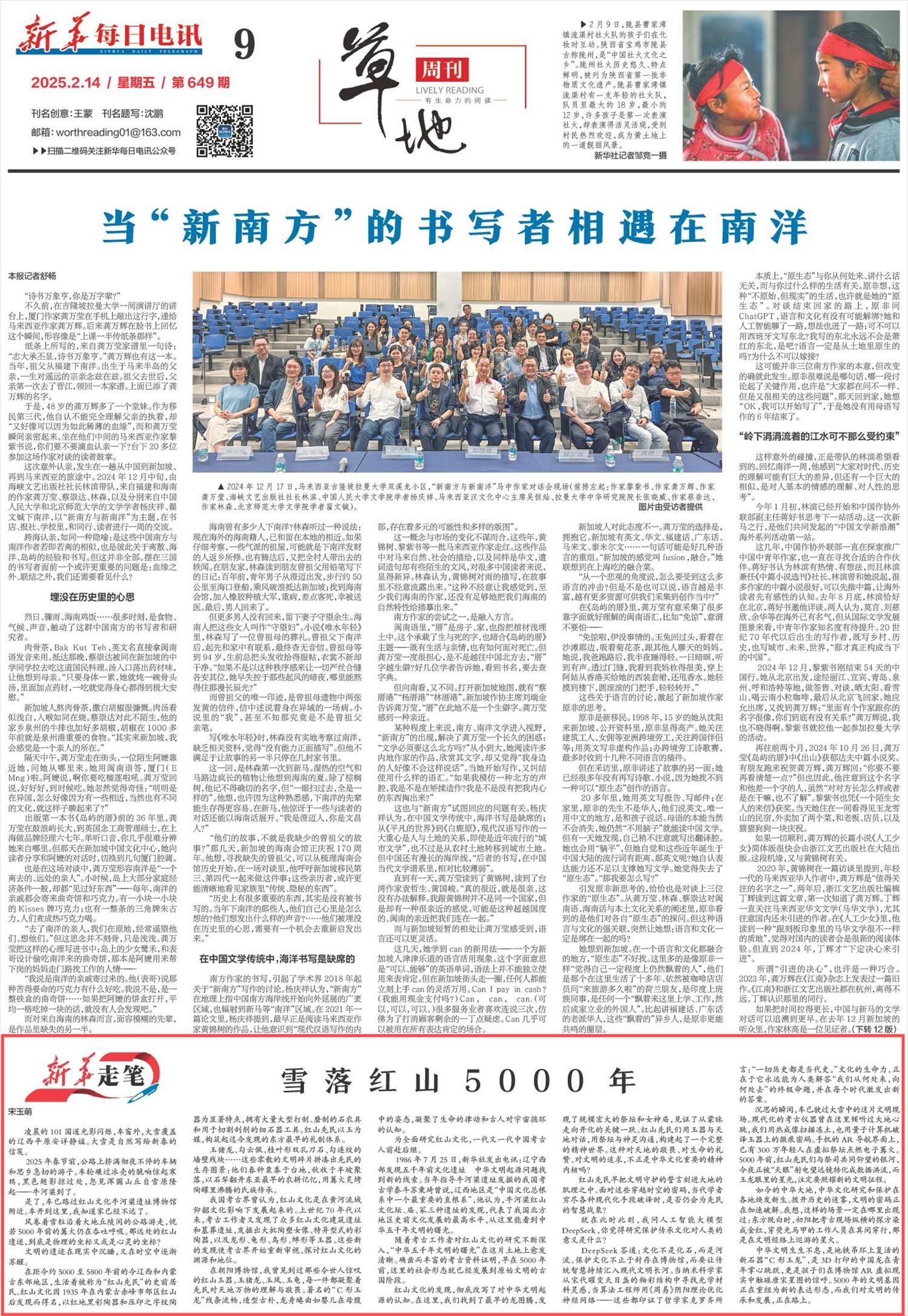2025年2月14日,《新华每日电讯》第9版刊发题为《雪落红山5000年》的报道,介绍了红山文化因1935年在内蒙古赤峰市郊区红山后发现而得名,以红地黑彩陶器和压印之字纹陶器为显著特点,拥有大量大型打制、磨制的石农具和用于切割刮削的细石器工具。