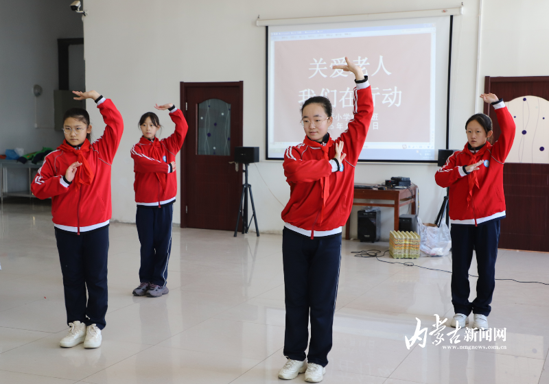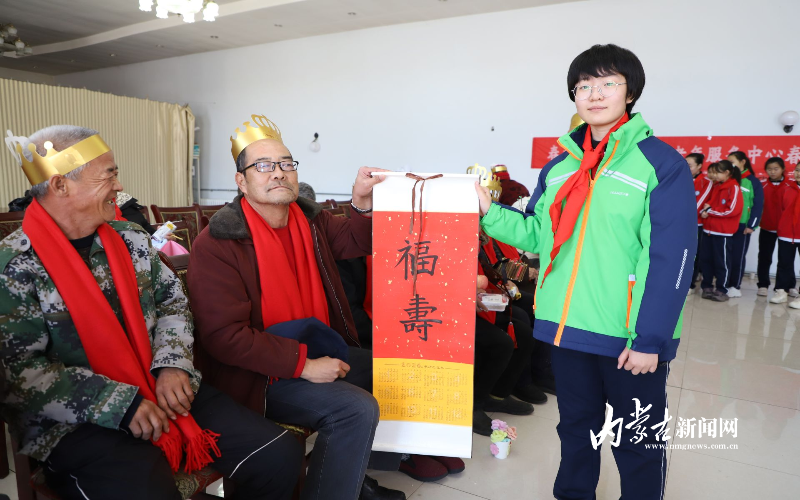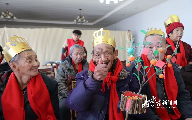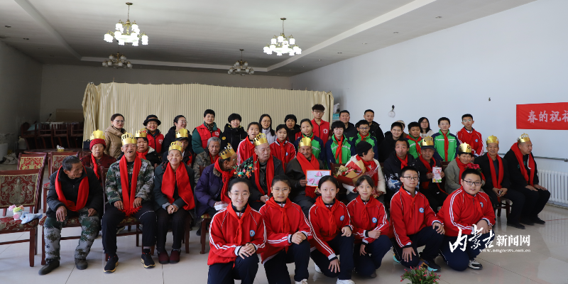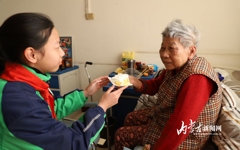 2月16日,呼和浩特市敬松老年公寓传出一阵阵欢声笑语,一群鲜艳的“红领巾”和20位老人欢聚一堂,为他们戴上暖暖的红围巾,送祝福切蛋糕,围着老人跳舞唱歌说段子。老人在孩子们的祝福声中许愿吃蛋糕,开心得合不拢嘴。