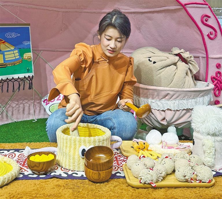 在毛绒游牧乐园红白食区域,游客不仅可以购买“牛肉干”“奶豆腐”“肚包肉”等文创产品,还可以与店员热情互动,沉浸式体验内蒙古早茶制作过程。