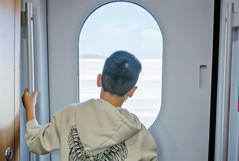 高铁列车上,巴特敖日喜呼看向窗外,欣赏沿途风景。