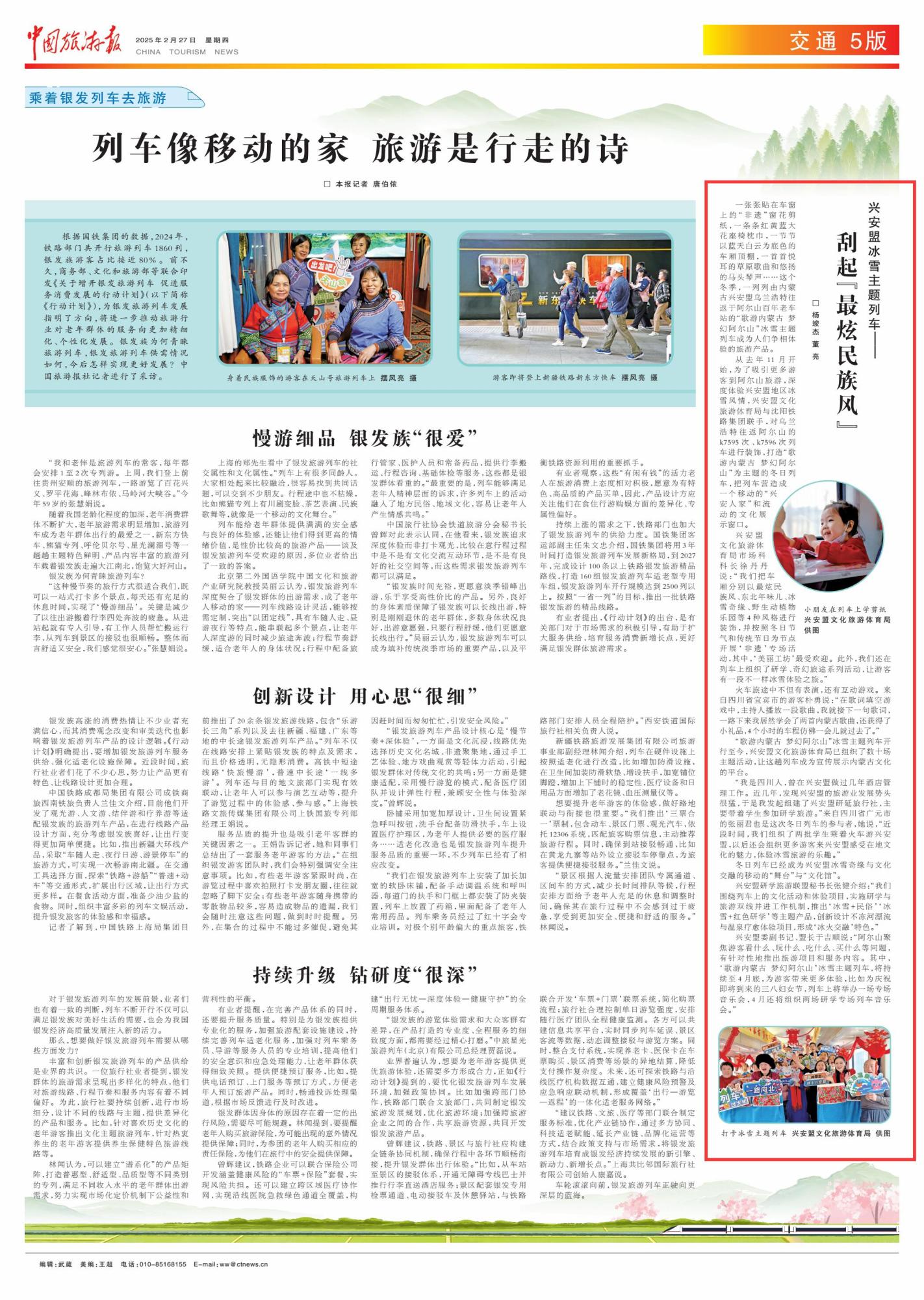2025年2月27日,《中国旅游报》第5版刊发题为《兴安盟冰雪主题列车——刮起“最炫民族风”》的文章,报道了一列列由内蒙古兴安盟乌兰浩特往返于阿尔山百年老车站的“歌游内蒙古 梦幻阿尔山”冰雪主题列车成为人们争相体验的旅游产品。