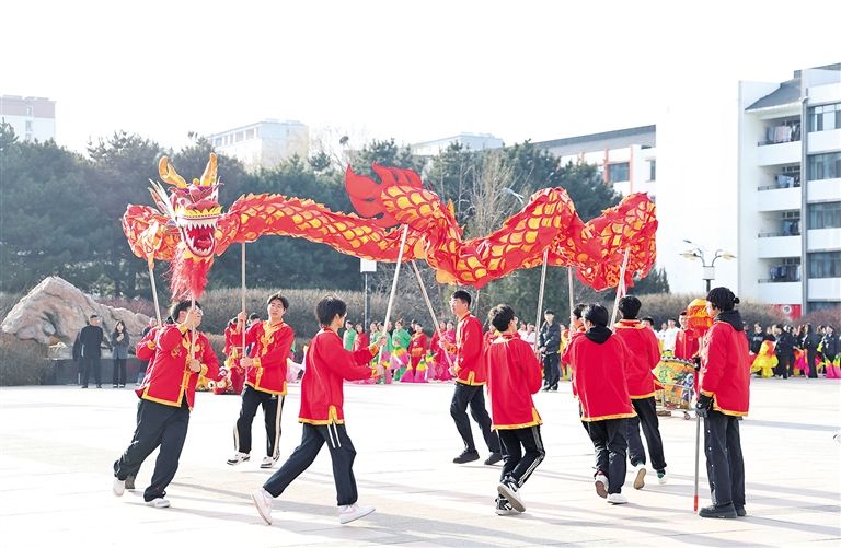 2月28日,为庆祝“二月二,龙抬头”这一传统节日,内蒙古鸿德文理学院的学生们在校园里表演舞龙、舞狮、喷火等非遗技艺。近年来,内蒙古鸿德文理学院积极开展美育浸润行动,大力弘扬中华优秀传统文化,通过丰富多彩的文体活动,引导学生展示美、体验美、创造美,切实将美育育人理念“落地生根”。草原云·内蒙古新闻网记者 贾奕村 摄