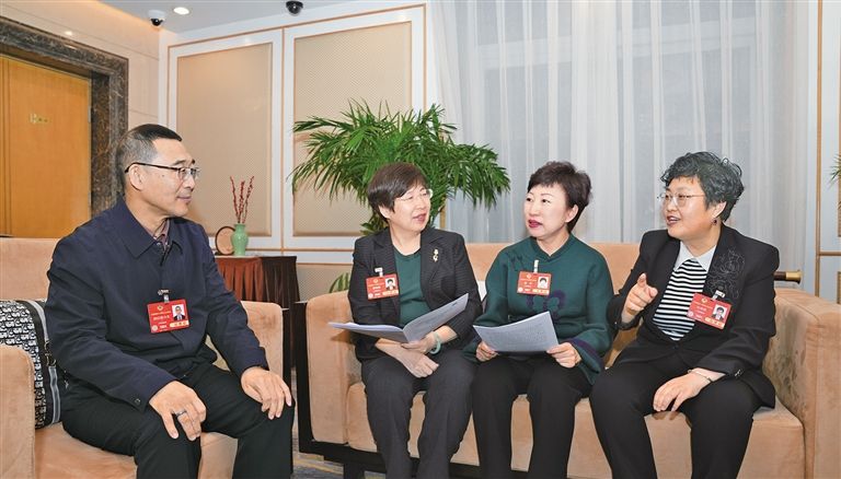 3月4日,住内蒙古全国政协委员纳日碧力戈、鄂晓梅、凌云、杜明燕(从左到右)在驻地热议全国政协常委会工作报告。草原云·内蒙古新闻网记者 王鹏 摄