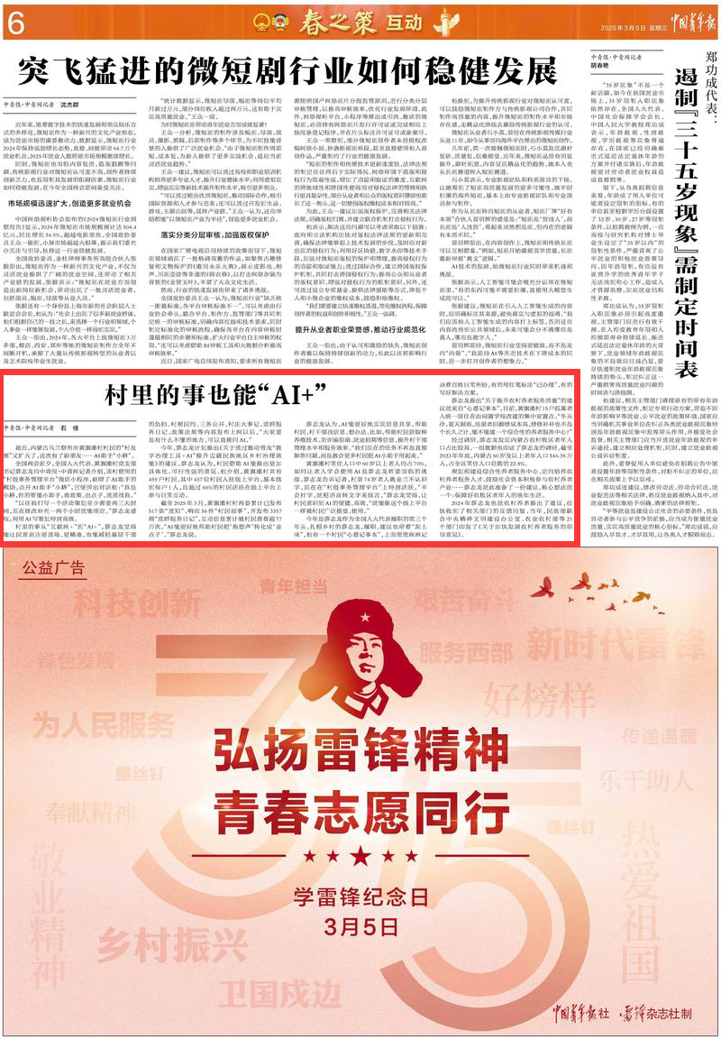 2025年3月5日,《中国青年报》第6版刊发题为《村里的事也能“AI+”》的文章,报道了内蒙古乌兰察布市黄旗滩村使用的“村级事务管理平台”微信小程序,新增了AI助手的模块。村里的事从“互联网+”到“AI+”,能让民意表达更通畅、更精准,也能减轻基层干部的负担。