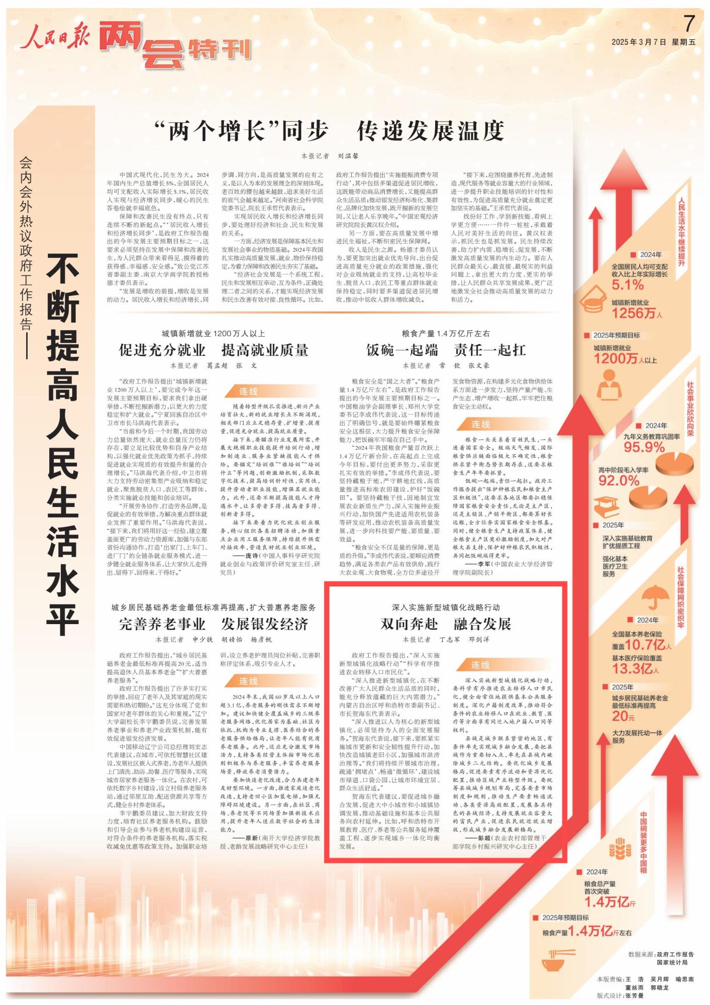 2025年3月7日,《人民日报》第7版刊发了题为《会内会外热议政府工作报告——不断提高人民生活水平》的文章,其中报道了内蒙古要促进城乡融合发展,促进大中小城市和小城镇协调发展,推动基础设施和基本公共服务向农村延伸。