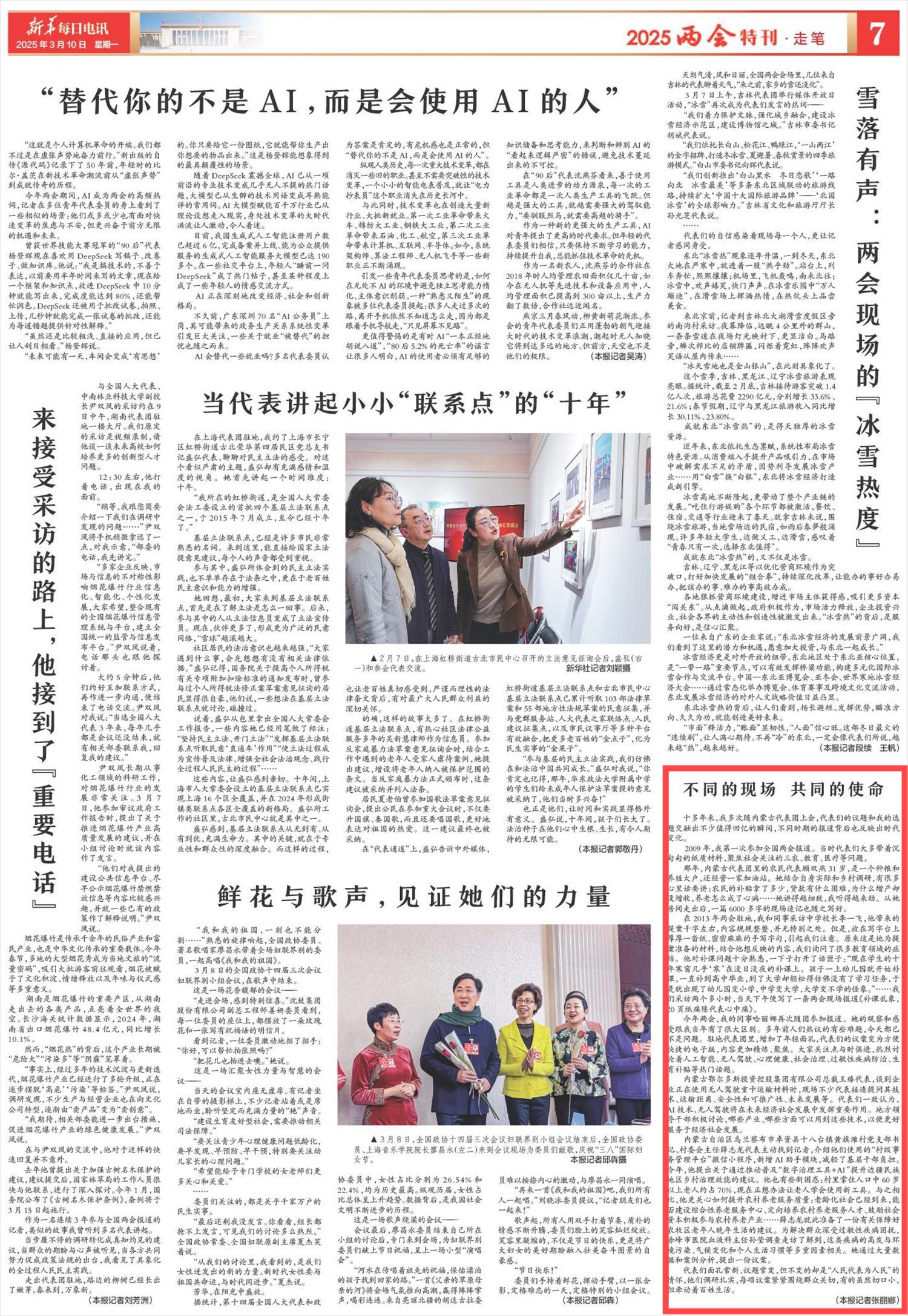 2025年3月10月,《新华每日电讯》第7版刊发题为《不同的现场 共同的使命》的文章,讲述了记者多次随内蒙古代表团上会,代表们的议题和记者的选题交融出不少值得回忆的瞬间,不同时期的报道背后也反映出时代变化。