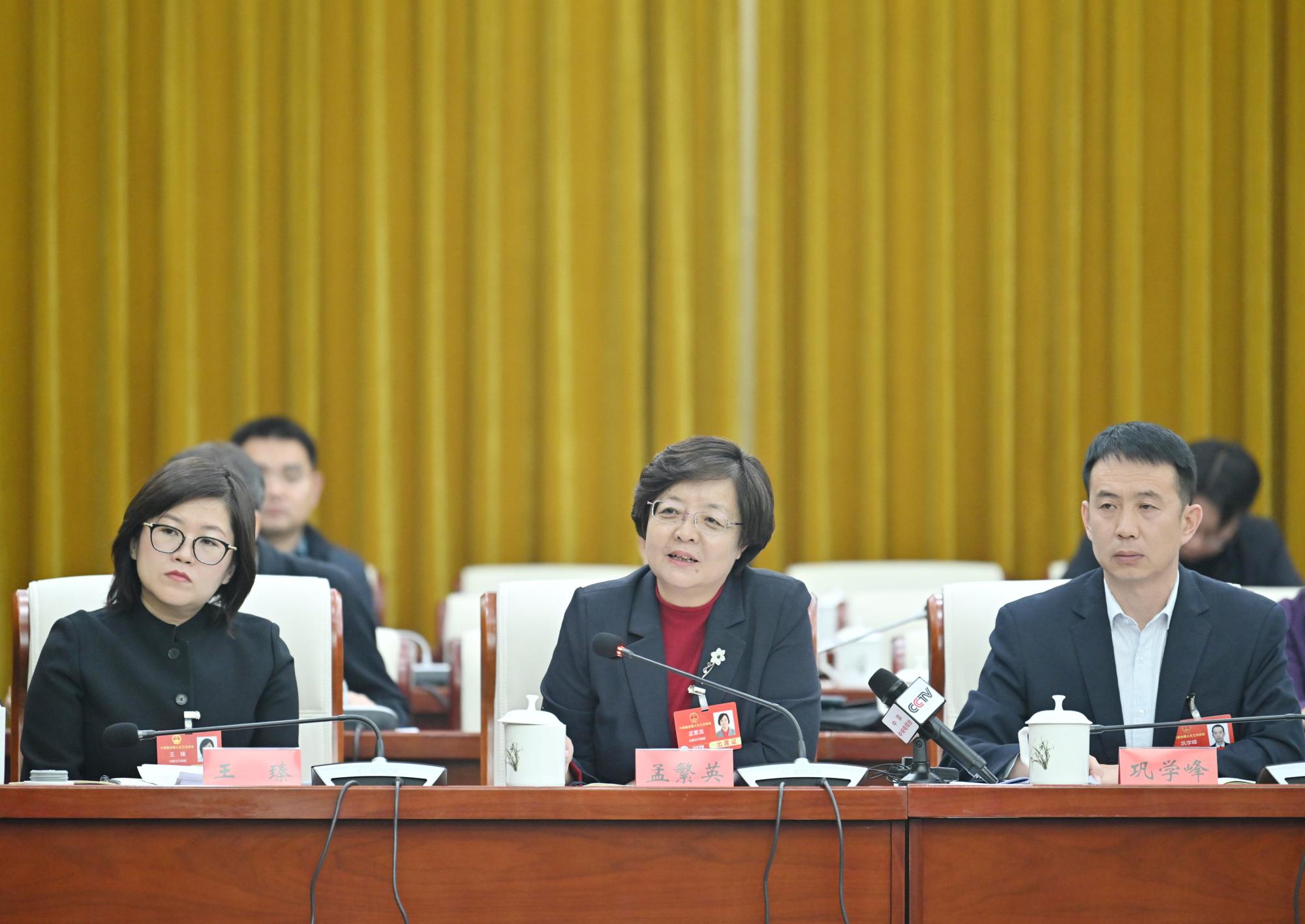 3月10日,全国人大代表孟繁英(中)在审议全国人大常委会工作报告时建议,加快建立以中国北方稀土集团等稀土龙头企业为主体,优势高校院所、稀土下游应用企业紧密协同共建,面向全国、辐射全球的稀土领域国家稀土技术创新中心。草原云记者 马建兵 摄