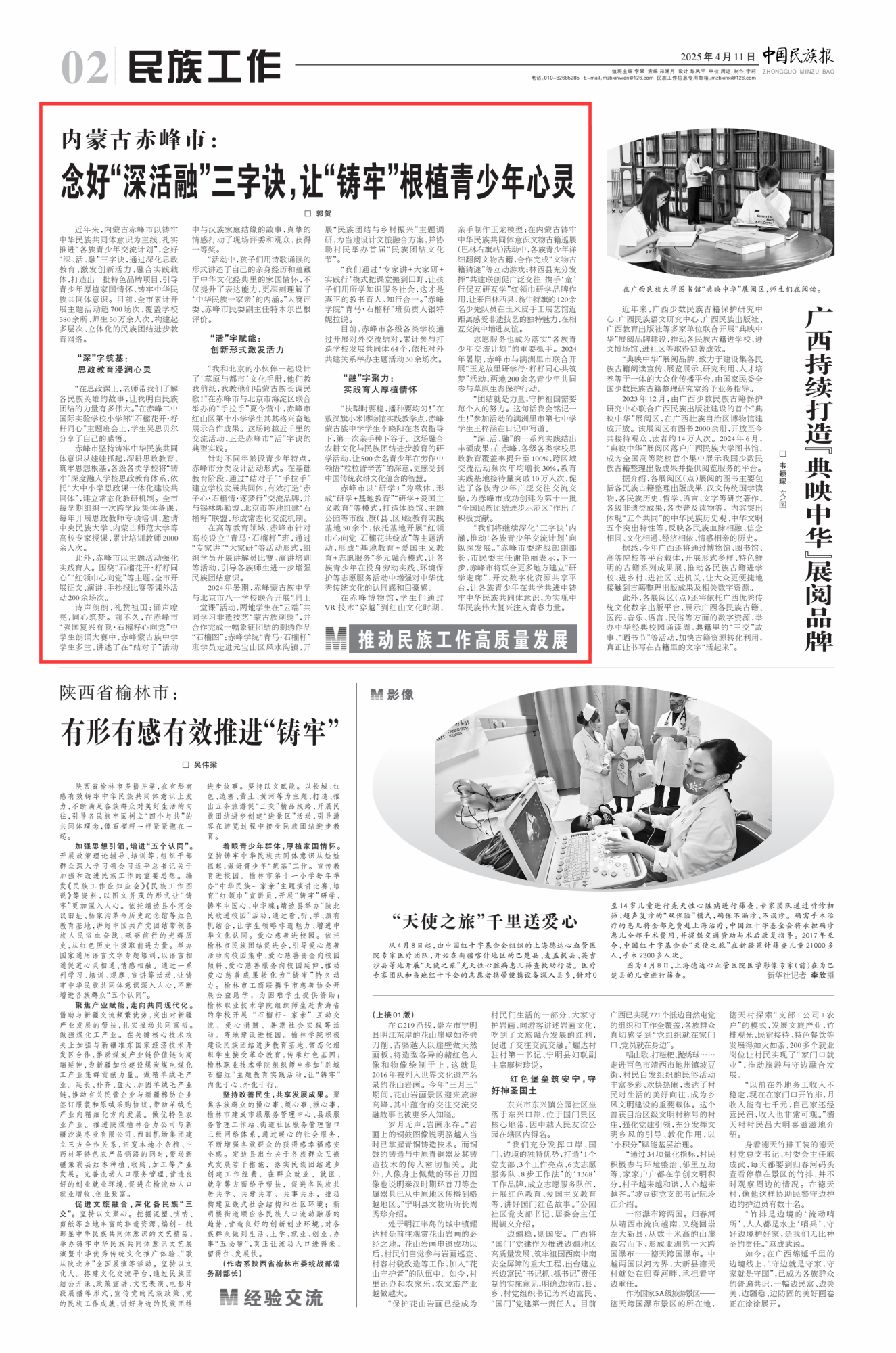 2025年4月11日,《中国民族报》第2版刊发题为《内蒙古赤峰市:念好“深活融”三字诀,让“铸牢”根植青少年心灵》的文章,报道了近年来,内蒙古赤峰市以铸牢中华民族共同体意识为主线,扎实推进“各族青少年交流计划”,念好“深、活、融”三字诀,通过深化思政教育、激发创新活力、融合实践载体,打造出一批特色品牌项目,引导青少年厚植家国情怀、铸牢中华民族共同体意识。