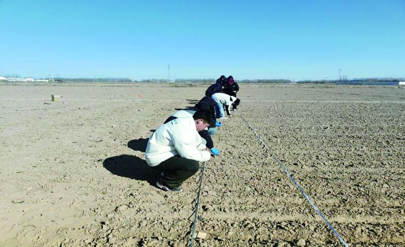 走进临河区狼山镇光明村万亩硬质小麦示范园区,远远就看到市区两级农技人员手持测距仪在田间来回穿梭,他们不时拉线打点、蹲身标记,确保每一粒种子精准植入土壤。
