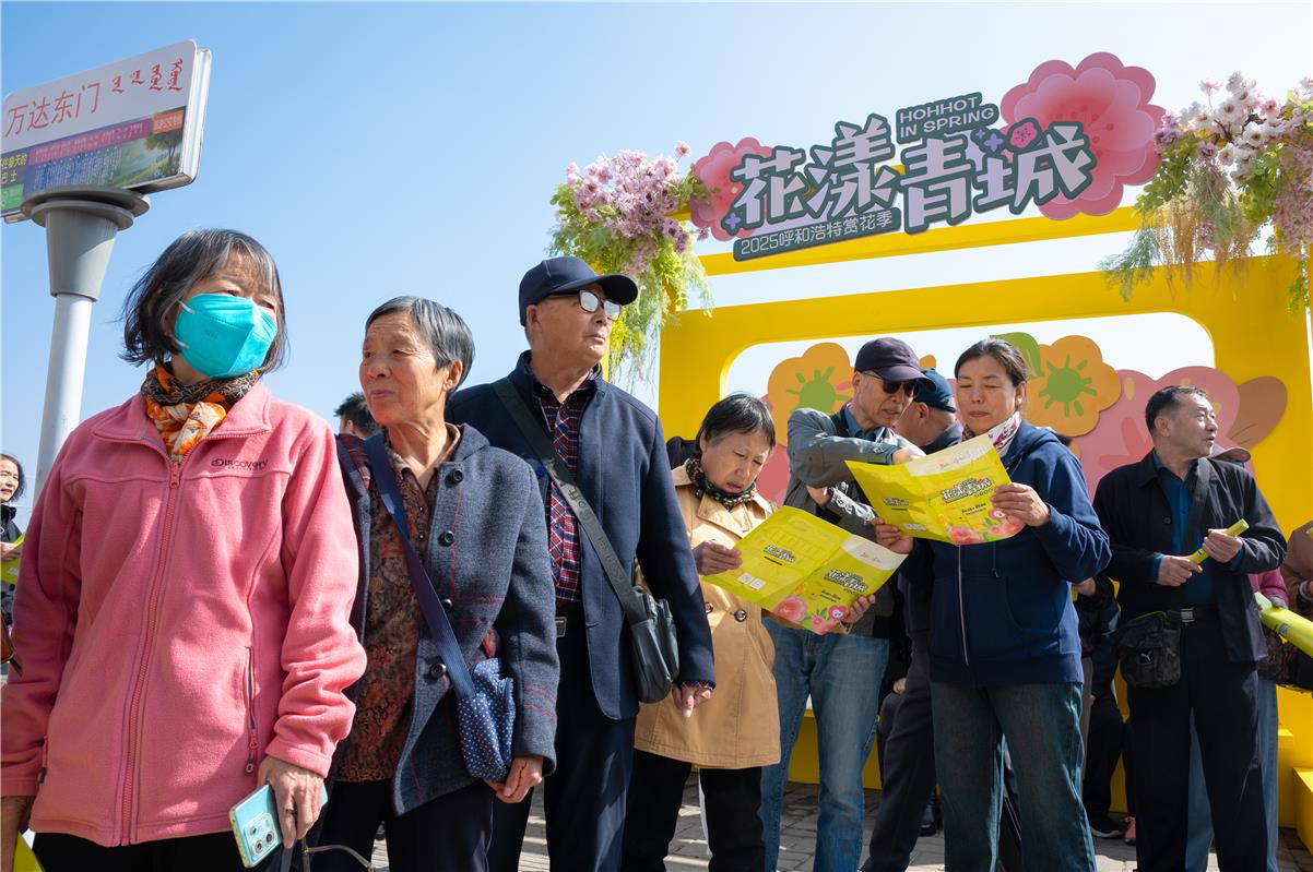 4月19日,市民游客在呼和浩特市雕塑艺术馆排队乘坐“开往春天的巴士”公交专车赏花春游。
