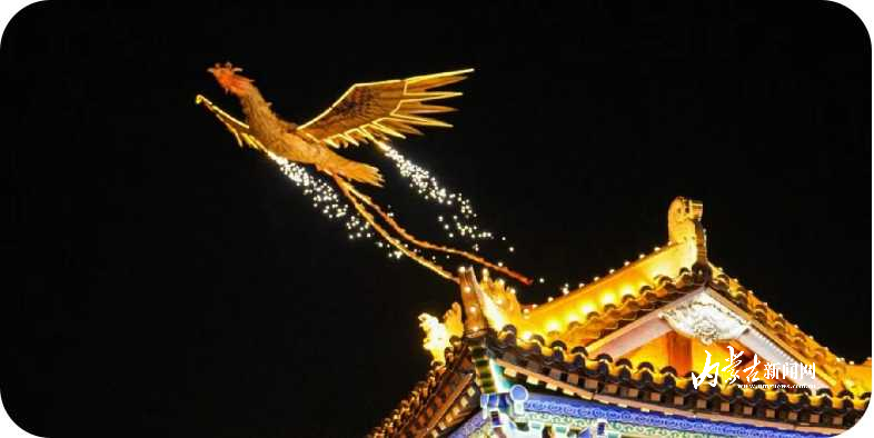 夜幕降临后,开始“福地玉泉 凤舞九天”的科技秀表演,巨型彩凤腾空而起,盘旋在塞上老街夜空中,与夜景相互辉映,展现“凤在天上飞、凰在空中舞”的绝美场景。