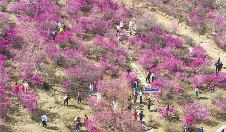 漫山遍野的杜鹃花竞相开放,游客纷纷用镜头记录美好瞬间。宝音德力格尔 摄