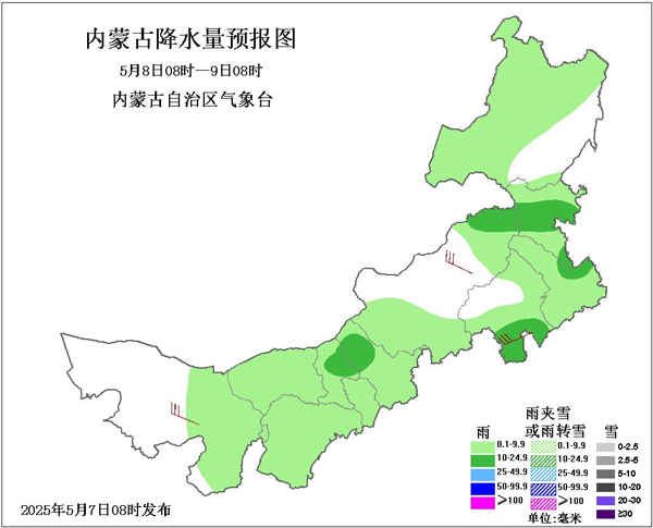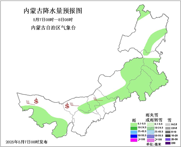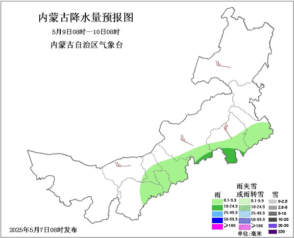 同时,随着冷空气的到来,全区大部降水也将上线。5月7~8日两天全区大部有小雨,其中,5月8日天包头市东北部、乌兰察布市北部部分地区、锡林郭勒盟东北部、赤峰市南部、通辽市东北部、兴安盟中部和东南部或有中雨。9日,降水范围显著缩减,仅在西部偏东南和中东部偏南地区有降水天气出现,其中锡林郭勒盟南部偏南、赤峰市南部偏南有中雨。