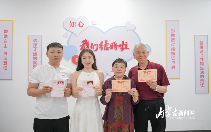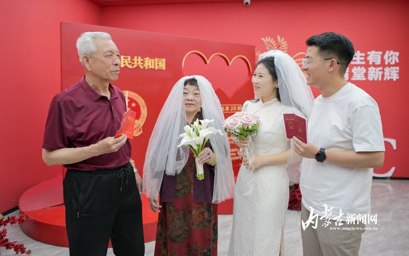 5月20日,呼和浩特市新城区新时代文明实践中心与新城区婚姻登记服务中心、东街街道等多部门联合打造“新式幸福 文明有礼”文明婚俗主题活动,新婚的年轻人与相携走过一生的老人们形成一场跨越时空的“爱情对话”。年轻人从老人们的故事中汲取力量,老人们则从一对对新人的幸福中,感受时代的变迁与传承。摄影/草原云·内蒙古新闻网首席记者 牛天甲
