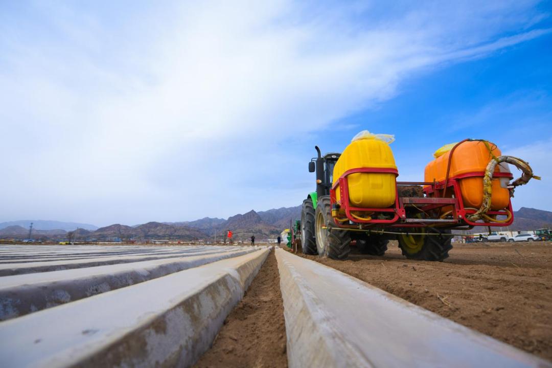 在鄂尔多斯市达拉特旗中化农业MAP侯家营子示范农场,配备了北斗导航系统的农机在田间作业。