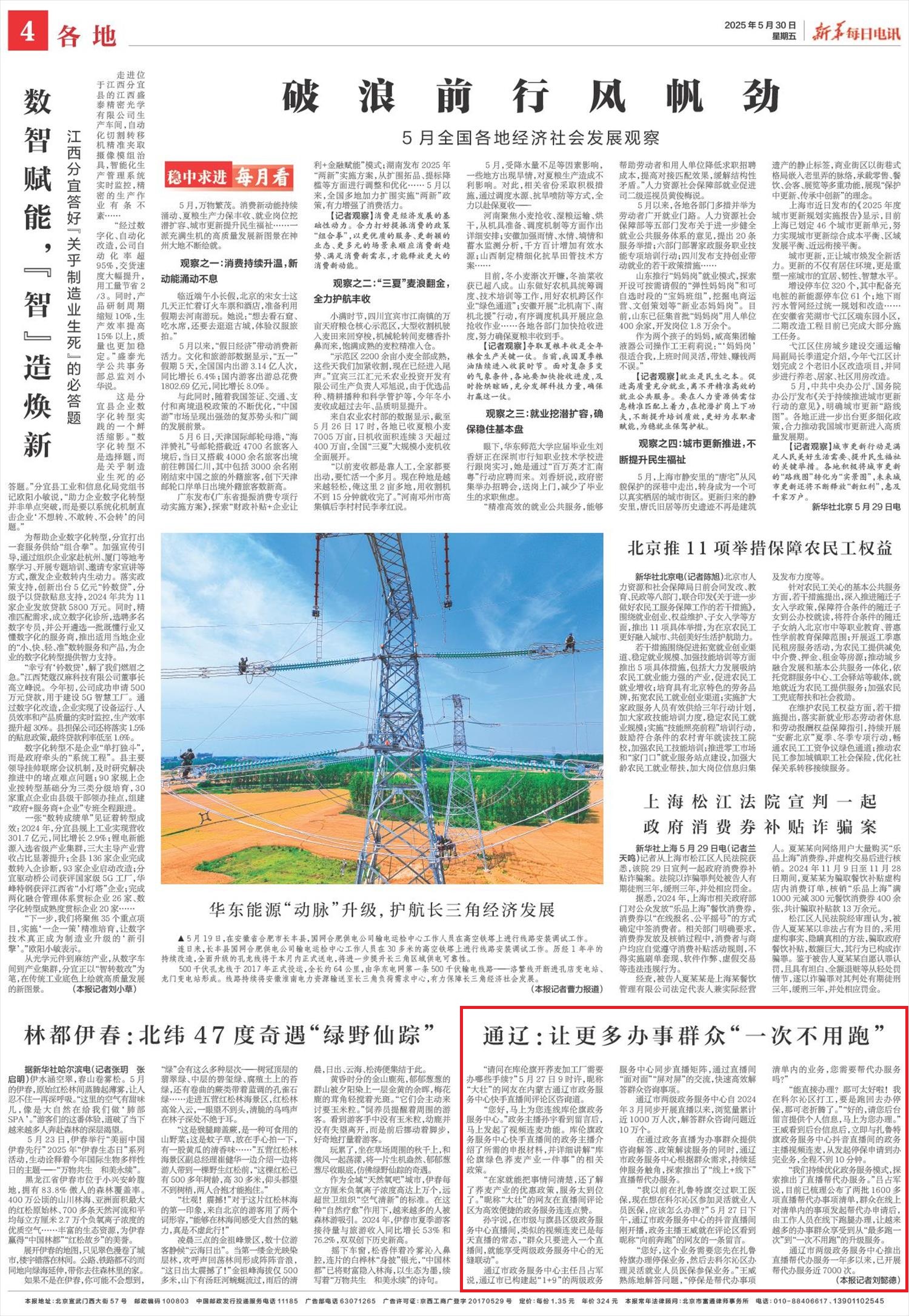 2025年5月30日,《新华每日电讯》第4版刊发题为《通辽:让更多办事群众“一次不用跑”》的文章,报道了通辽市自 2024 年 3 月构建 “1+9” 两级政务直播矩阵,累计浏览量近 1000 万人次,解答咨询超 10 万个。目前已梳理 1600 余项直播帮代办事项,开展帮代办服务近 7000 次,实现政务服务从 “最多跑一次” 到 “一次不用跑” 的升级。