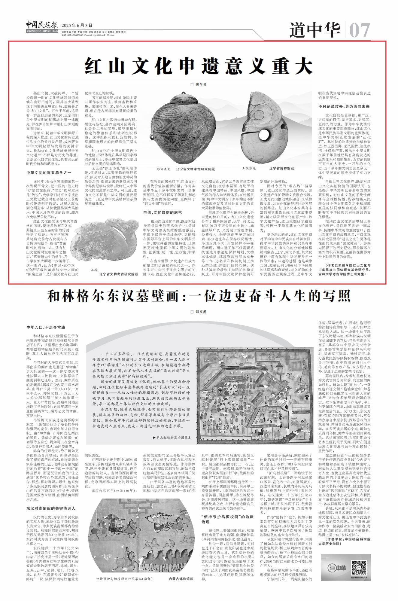 2025年6月3日,《中国民族报》第7版刊发题为《红山文化申遗意义重大》的文章,报道了红山文化因内蒙古赤峰红山后首次发现得名,距今五六千年,以粟作农业为基,聚落布局含居住、祭祀、墓葬分区,展现早期社会组织雏形。其 “以玉为礼”“龙图腾崇拜” 等文化基因,在夏商周文明中延续,成为中华文明重要源头与民族精神谱系奠基者。