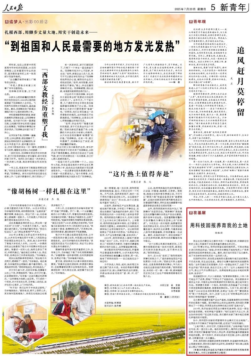 7月20日,《人民日报》第5版刊发题为《用科技回报养育我的土地》,报道了乌兰察布市农林科学研究所牧草课题组负责人徐振朋和团队同事选育耐寒旱、抗盐碱的牧草品种,让荒漠变绿洲,同时深化循环农业研究,探索更多“绿水青山就是金山银山”的转化路径。