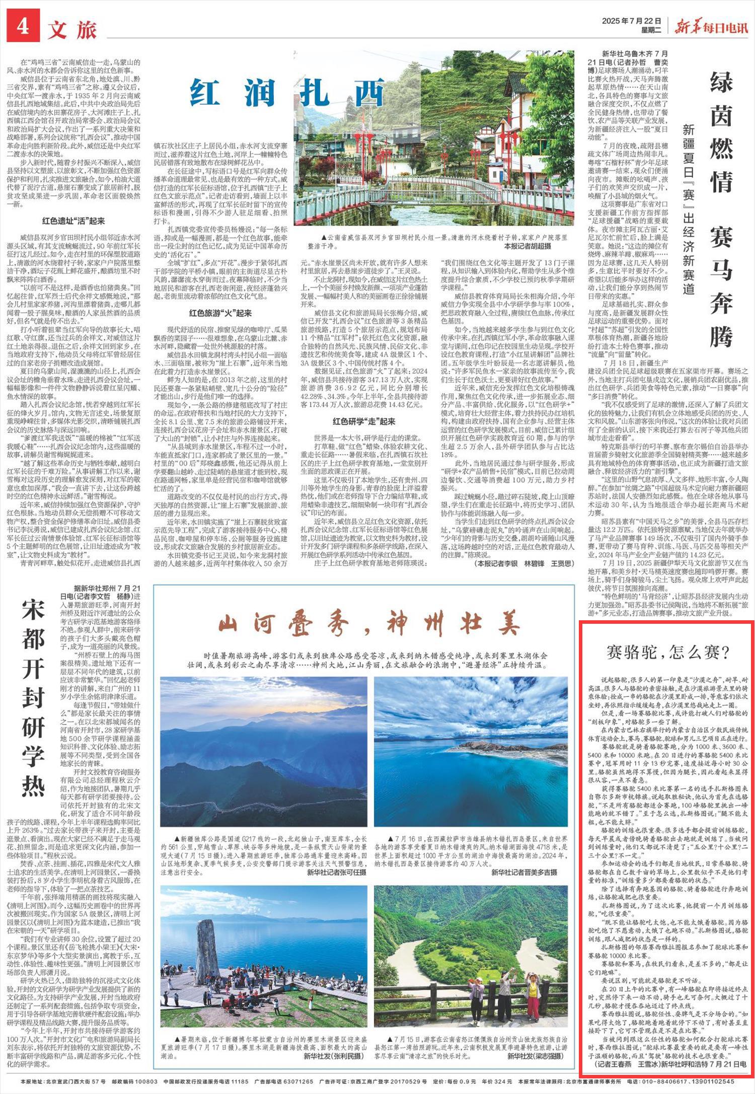 2025年7月22日《新华每日电讯》第4版刊发了《赛骆驼,怎么赛?》的文章,报道了在内蒙古巴林右旗举行的内蒙古自治区少数民族传统体育运动会上,赛马、赛骆驼、驼球和男儿三艺项目正在进行。赛骆驼就是骑着骆驼赛跑,分为1000米、3600米、5400米和10000米跑。