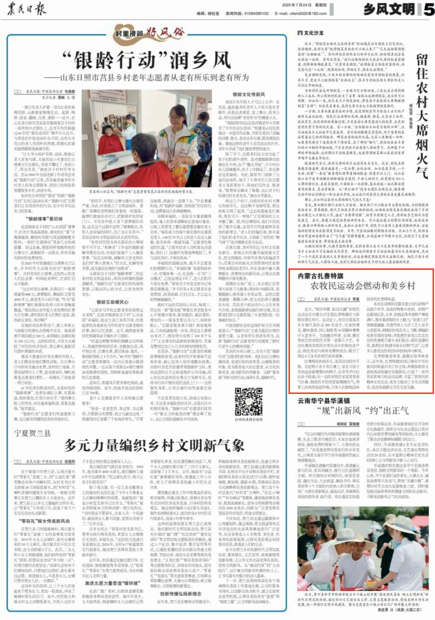 2025年7月24日,《农民日报》第5版刊发题为《内蒙古扎赉特旗:农牧民运动会燃动和美乡村》的文章,报道了“稻田欢歌 跃动北疆”农牧民运动会近日在内蒙古兴安盟扎赉特旗好力保稻谷景区举行。运动会上,来自全盟各苏木乡镇代表队近500名选手,在迷你博克、趣味篮球、同心制胜等10项趣味赛事中大显身手。当地擅长呼麦、长调、搏克等技艺的农牧民齐聚一堂展示才艺。