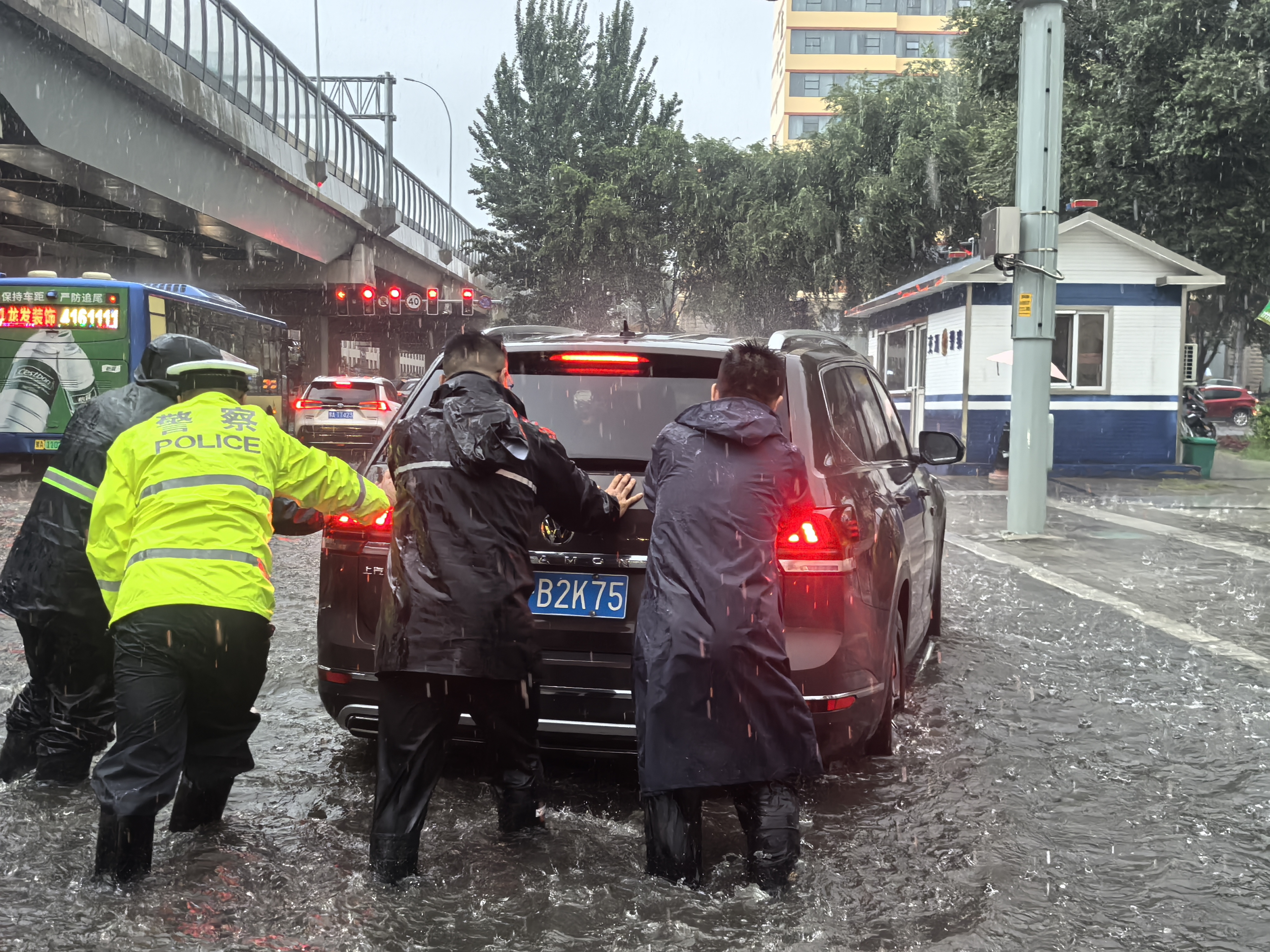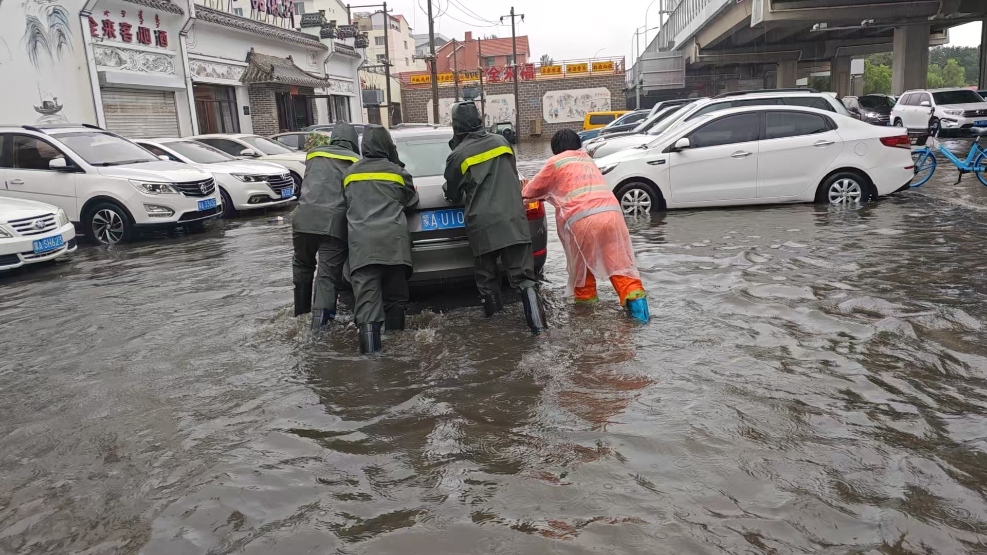 7月25日,呼和浩特市遭遇强降雨天气,多地出现积水,部分车辆被困水中,市民出行受阻。
