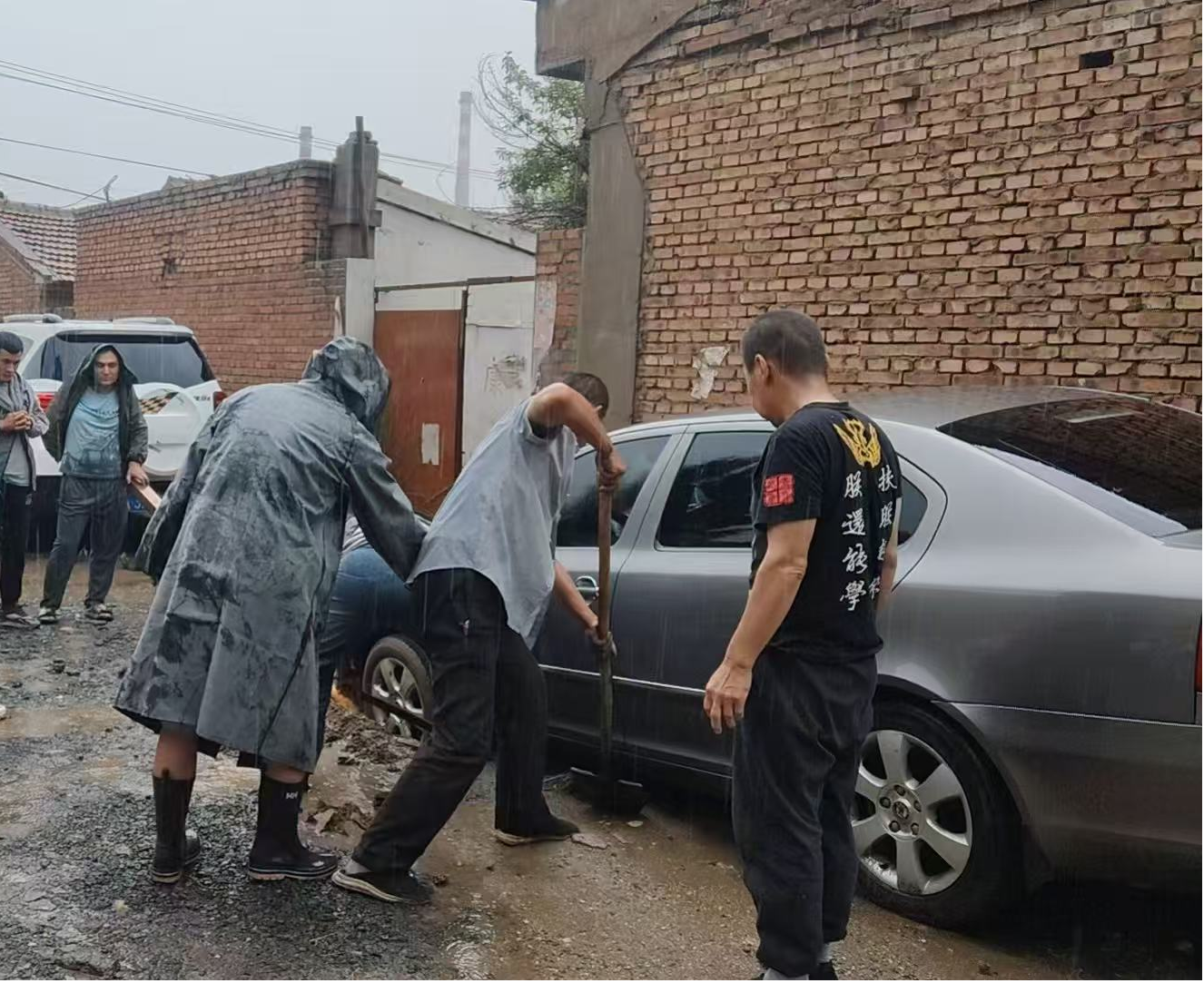 中专路街道春雨社区新时代文明实践站对徐家沙梁平房区受困车辆进行救援。
