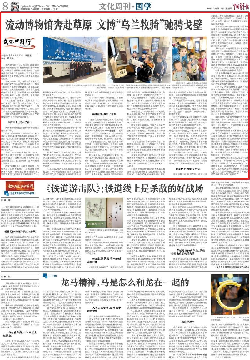 2025年8月15日,《中国青年报》第8版刊发了《流动博物馆奔赴草原 文博“乌兰牧骑”驰骋戈壁》的文章,报道了内蒙古博物院流动数字博物馆作为文博战线的“乌兰牧骑”,以数字化技术为支撑,将文物文化资源送到基层,成为连接草原与历史的流动文化桥梁,获评 2024年度文物事业高质量发展推介案例。
