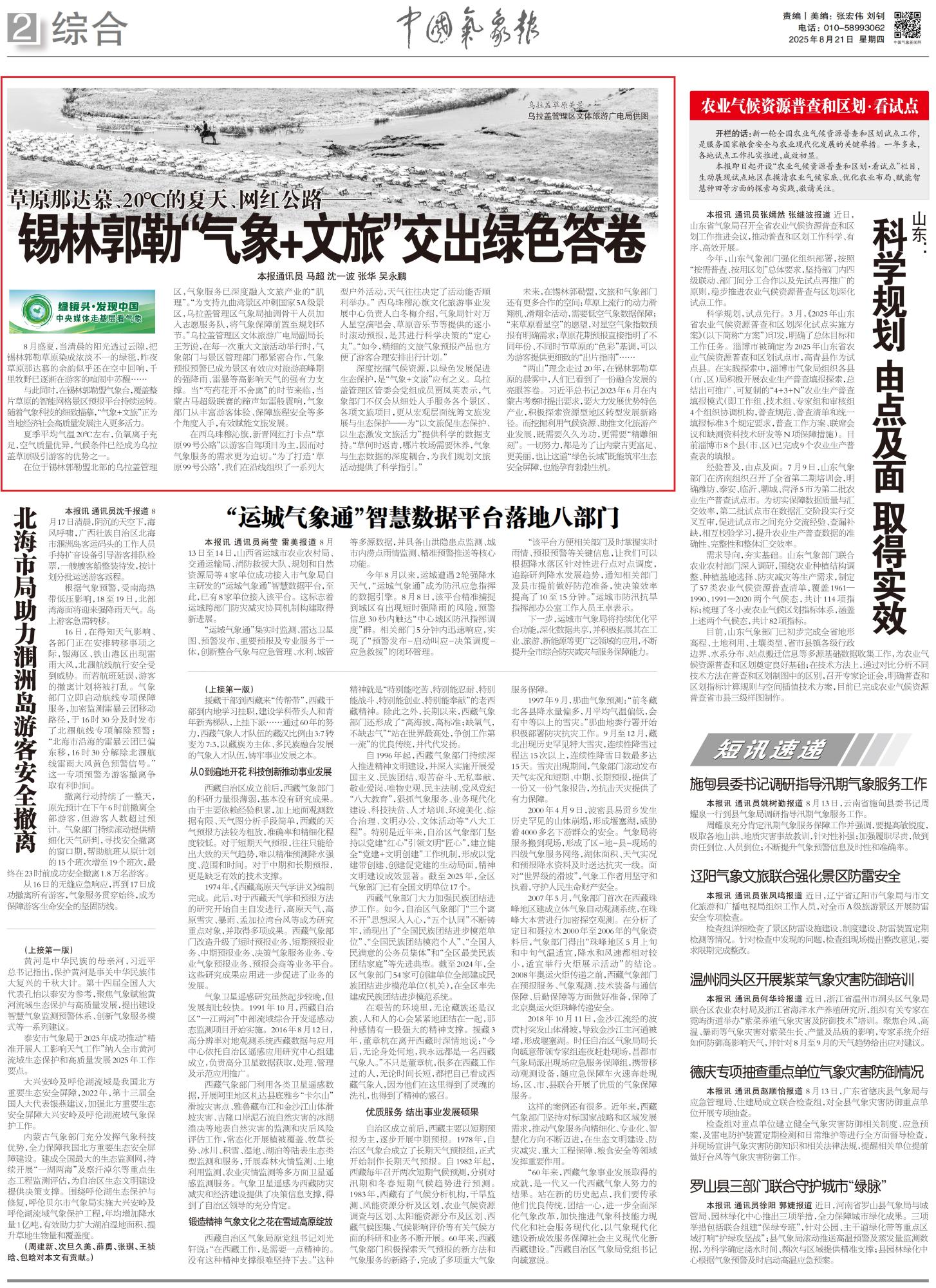 2025年8月21日,《中国气象报》第2版刊发题为《草原那达慕、20℃的夏天、网红公路—锡林郭勒“气象+文旅”交出绿色答卷》的文章,报道了在锡林郭勒盟气象台,覆盖整片草原的智能网格景区预报平台持续运转。随着气象科技的细致描摹,“气象+文旅”正为当地经济社会高质量发展注入更多活力。