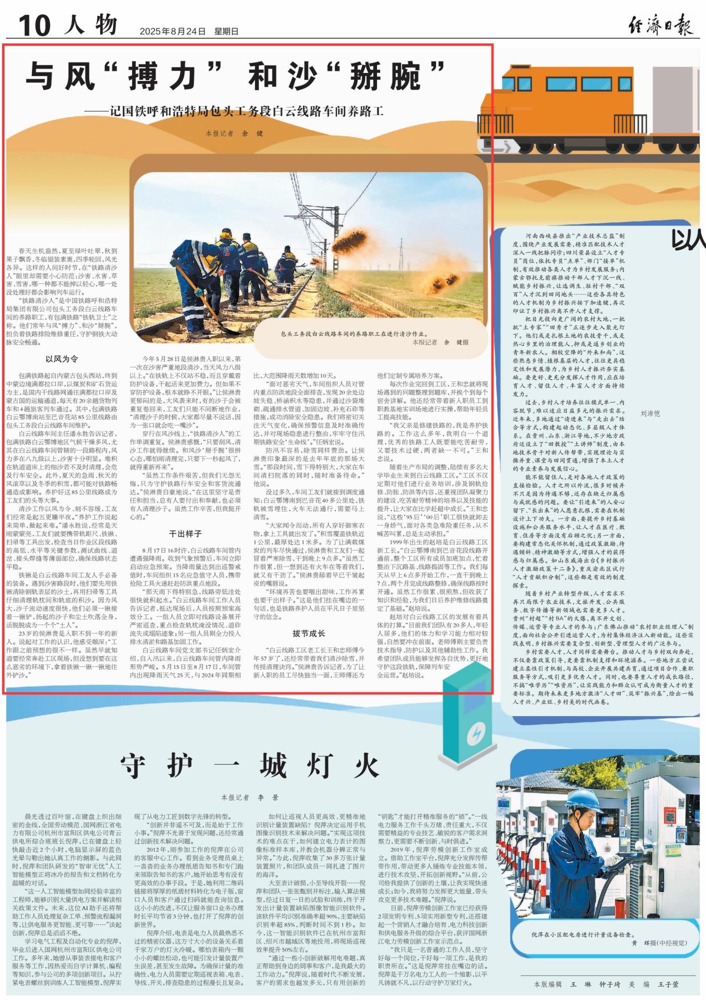 2025年8月24日,《经济日报》第10版刊发题为《与风“搏力” 和沙“掰腕”——记国铁呼和浩特局包头工务段白云线路车间养路工》的文章,报道了中国铁路呼和浩特局集团有限公司包头工务段白云线路车间的养路职工,他们常年与风“搏力”、和沙“掰腕”,担负着铁路排险维修重任,守护钢铁大动脉安全畅通。