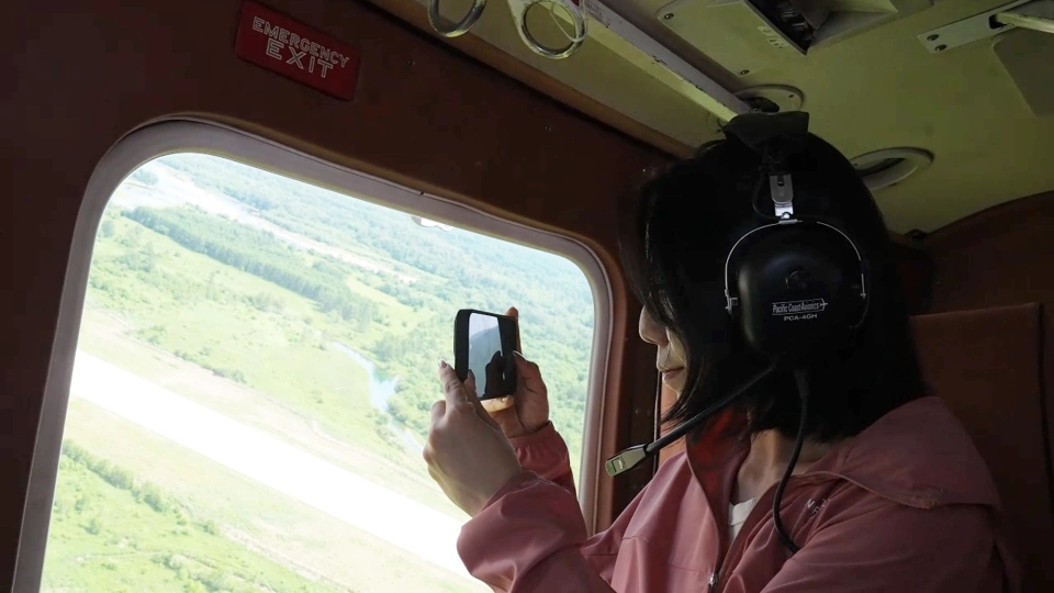 游客乘直升飞机俯瞰呼伦贝尔市根河境内的大兴安岭自然风光。